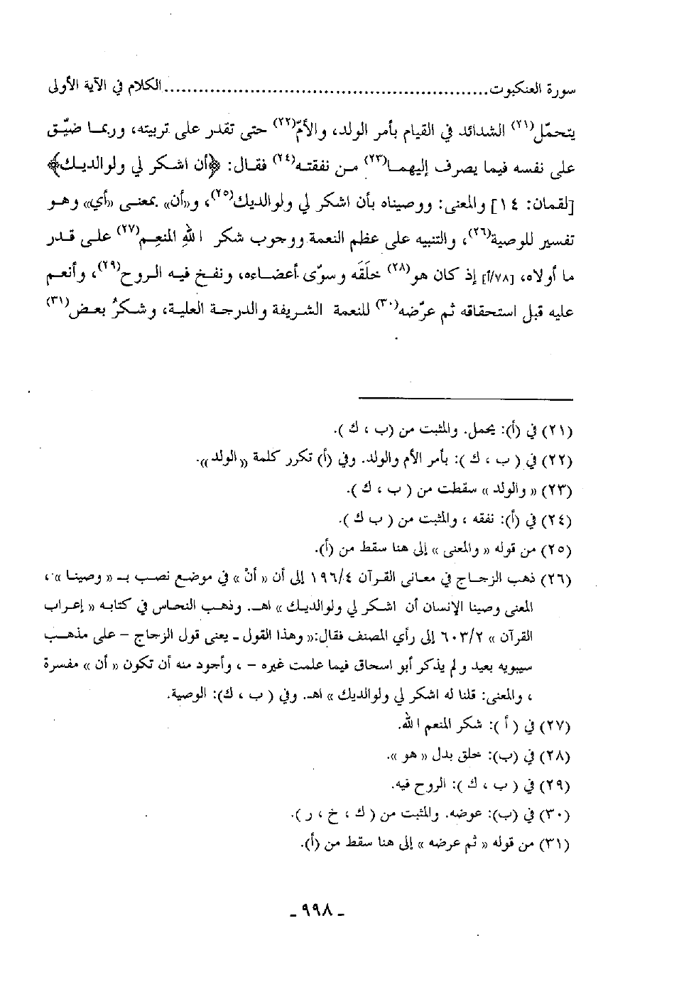 يتحمّل الشدائد في القيام بأمر الولد، والأمّ حتى تقدر على تربيته، وربما ضيّق على نفسه فيما يصرف إليهما من نفقته فقال: (أن اشكر لي ولوالديك) ، والمعنى: ووصيناه بأن اشكر لي ولوالديك، و"أن" بمعنى "أي" وهو تفسير للوصية، والتنبيه على عظم النعمة ووجوب شكر اللهِ المنعِم على قدر ما أولاه، إذ كان هو خلَقَه وسوّى أعضاءه، ونفخ فيه الروح، وأنعم عليه قبل استحقاقه ثم عرّضه للنعمة الشريفة والدرجة العلية وشكرُ بعض