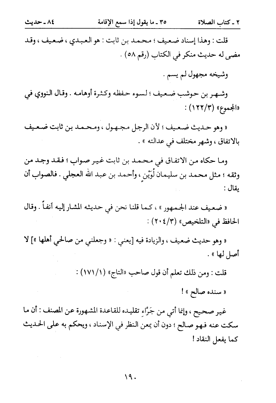 قلت: وهذا إسناد ضعيف؛ محمد بن ثابت: هو العبدي، ضعيف، وقد
