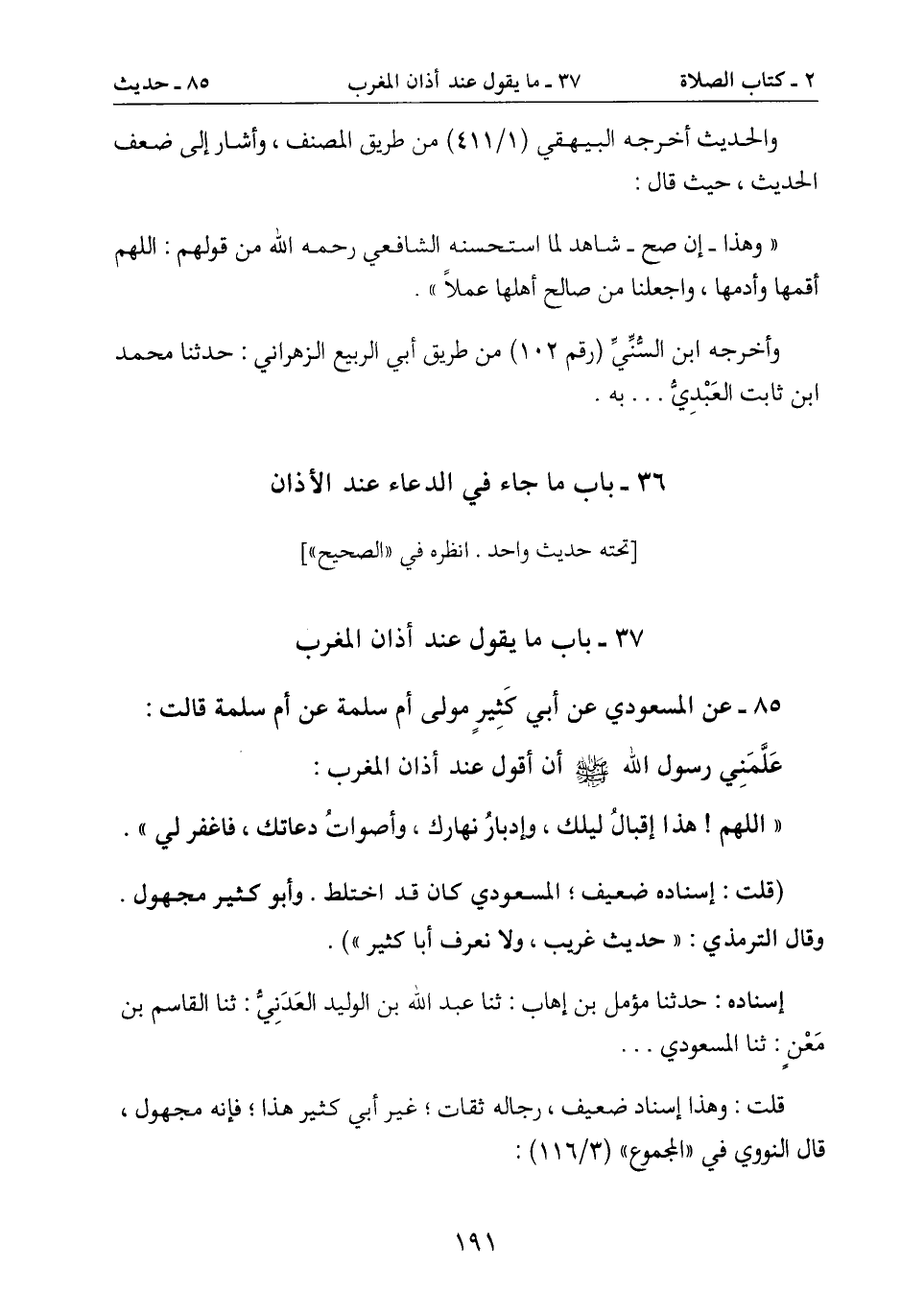 والحديث أخرجه البيهقي (1/411) من طريق المصنف، وأشار إلى ضعف