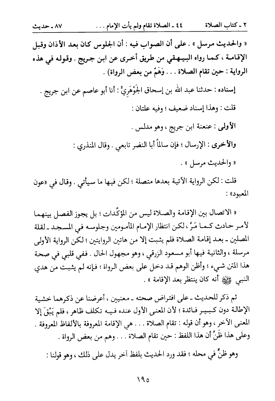 النبي صَلَّى اللَّهُ عَلَيْهِ وَسَلَّمَ أنه كان ينتظر بعد الإقامة ".