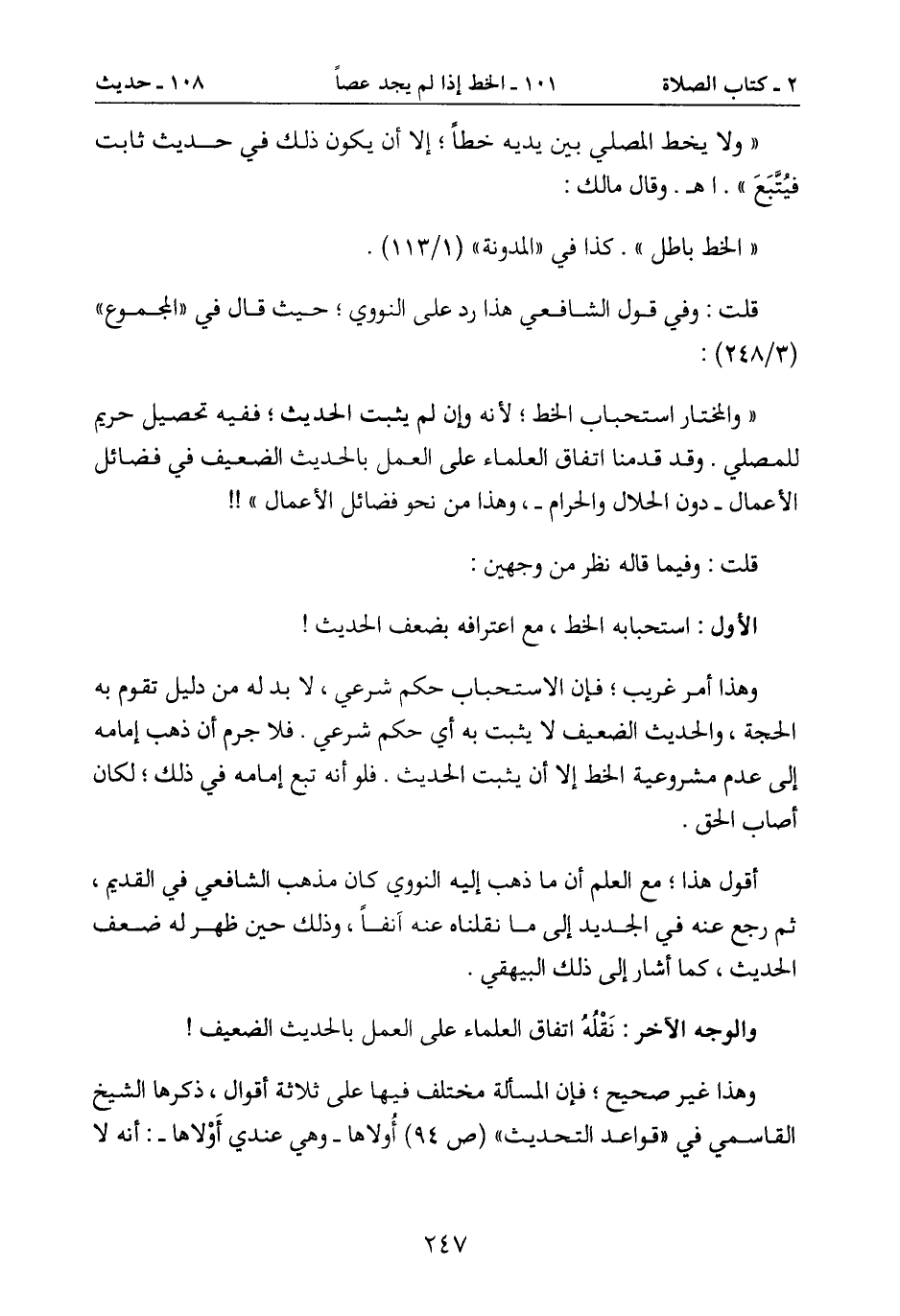 " ولا يخط المصلي بين يديه خطاً؛ إلا أن يكون ذلك في حديث ثابت