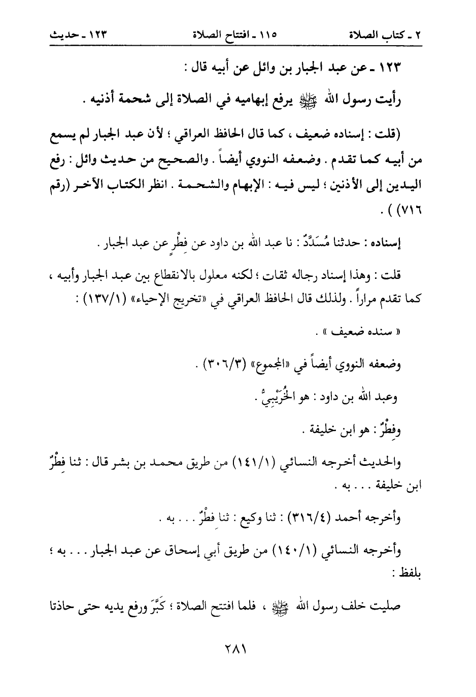 (قلت: إسناده ضعيف، كما قال الحافظ العراقي؛ لأن عبد الجبار لم يسمع