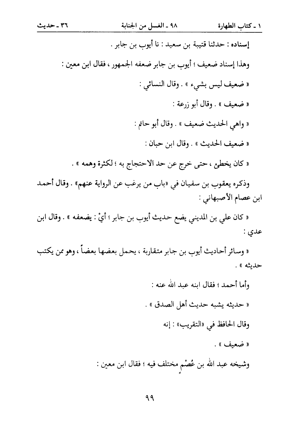 " كان علي بن المديني يضع حديث أيوب بن جابر؛ أيْ: يضعفه ". وقال ابن