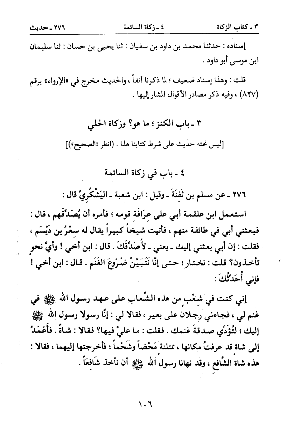 إليك؛ لتُؤدي صدقة غنمك. فقلت: ما علي فيها؟ فقالا: شاةٌ. فأعْمدُ