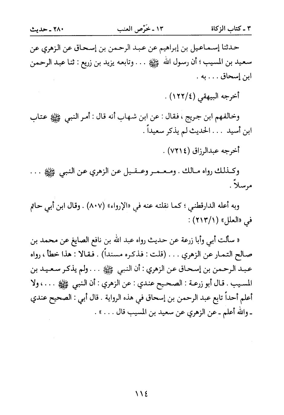 المسيب. قال أبو زرعة: الصحيح عندي: عن الزهري: أن النبي صَلَّى اللَّهُ عَلَيْهِ وَسَلَّمَ ... ، ولا