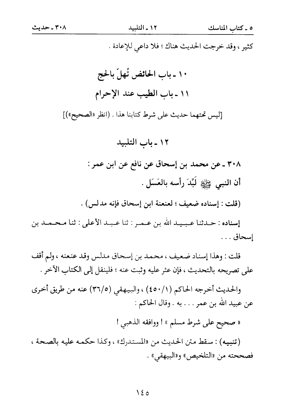 أن النبي صَلَّى اللَّهُ عَلَيْهِ وَسَلَّمَ لبّد رأسه بالعسل.