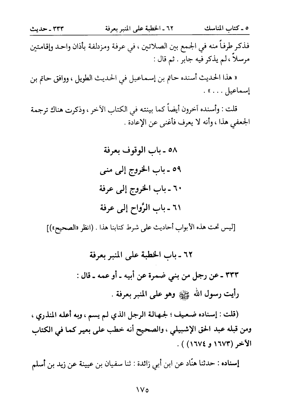 فذكر طرفاً منه في الجمع بين الصلاتين، في عرفة ومزدلفة بأذان واحد وإقامتين