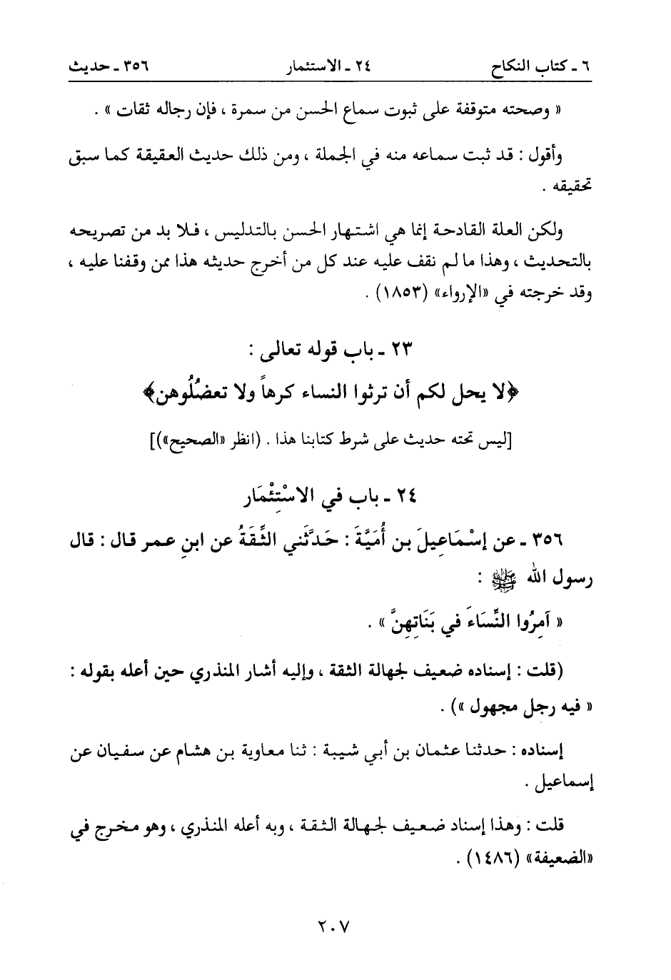 " وصحته متوقفة على ثبوت سماع الحسن من سمرة، فإن رجاله ثقات ".