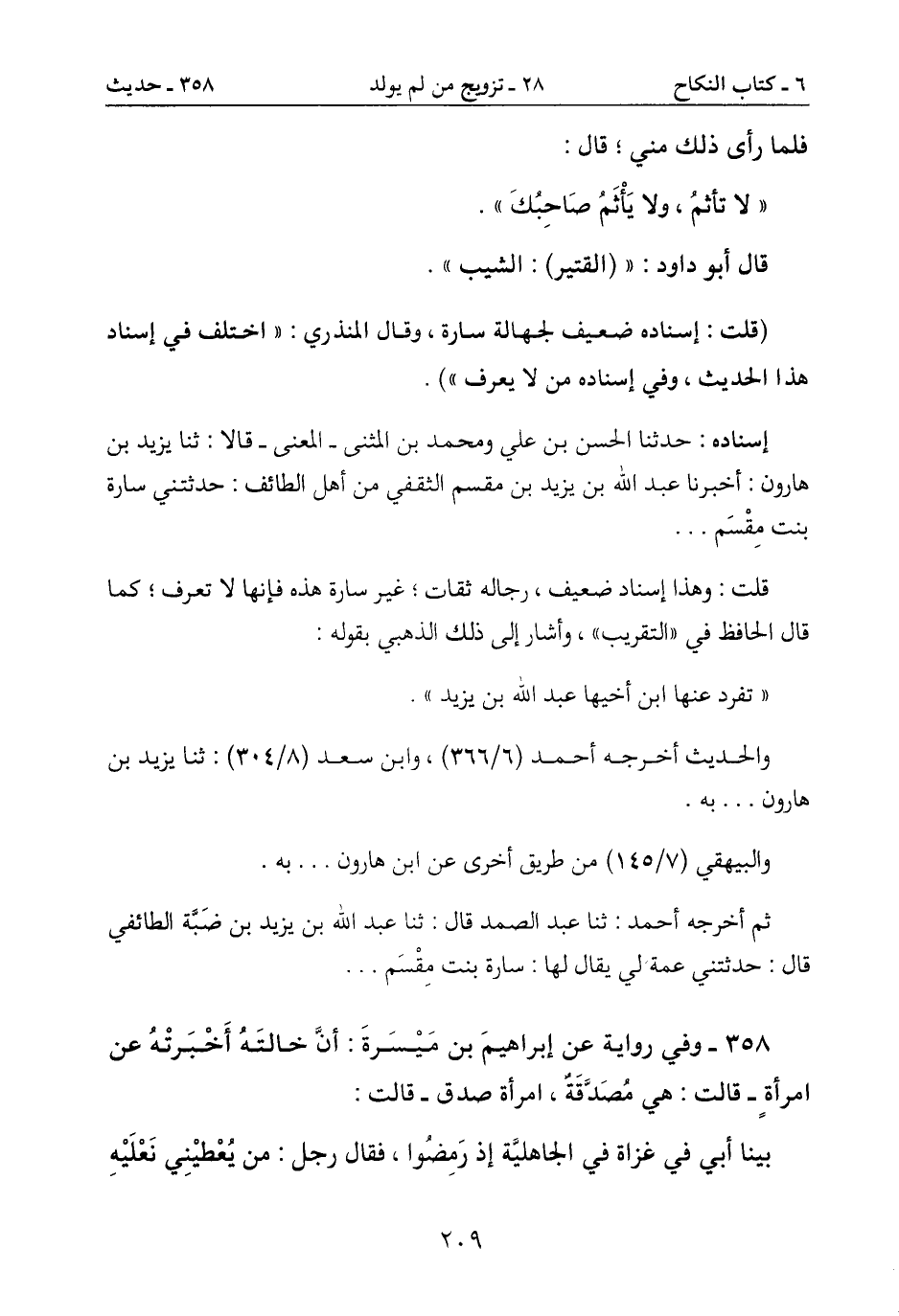 (قلت: إسناده ضعيف لجهالة سارة، وقال المنذري: " اختلف في إسناد