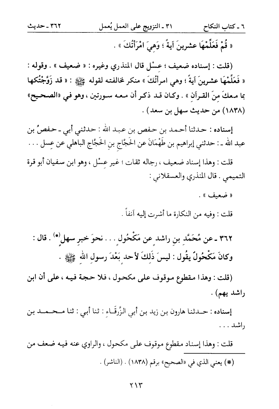 " فعلِّمْها عشرين آية؛ وهي امرأتُك " منكر لمخالفته لقوله صَلَّى اللَّهُ عَلَيْهِ وَسَلَّمَ: " قد زوجْتُكها
