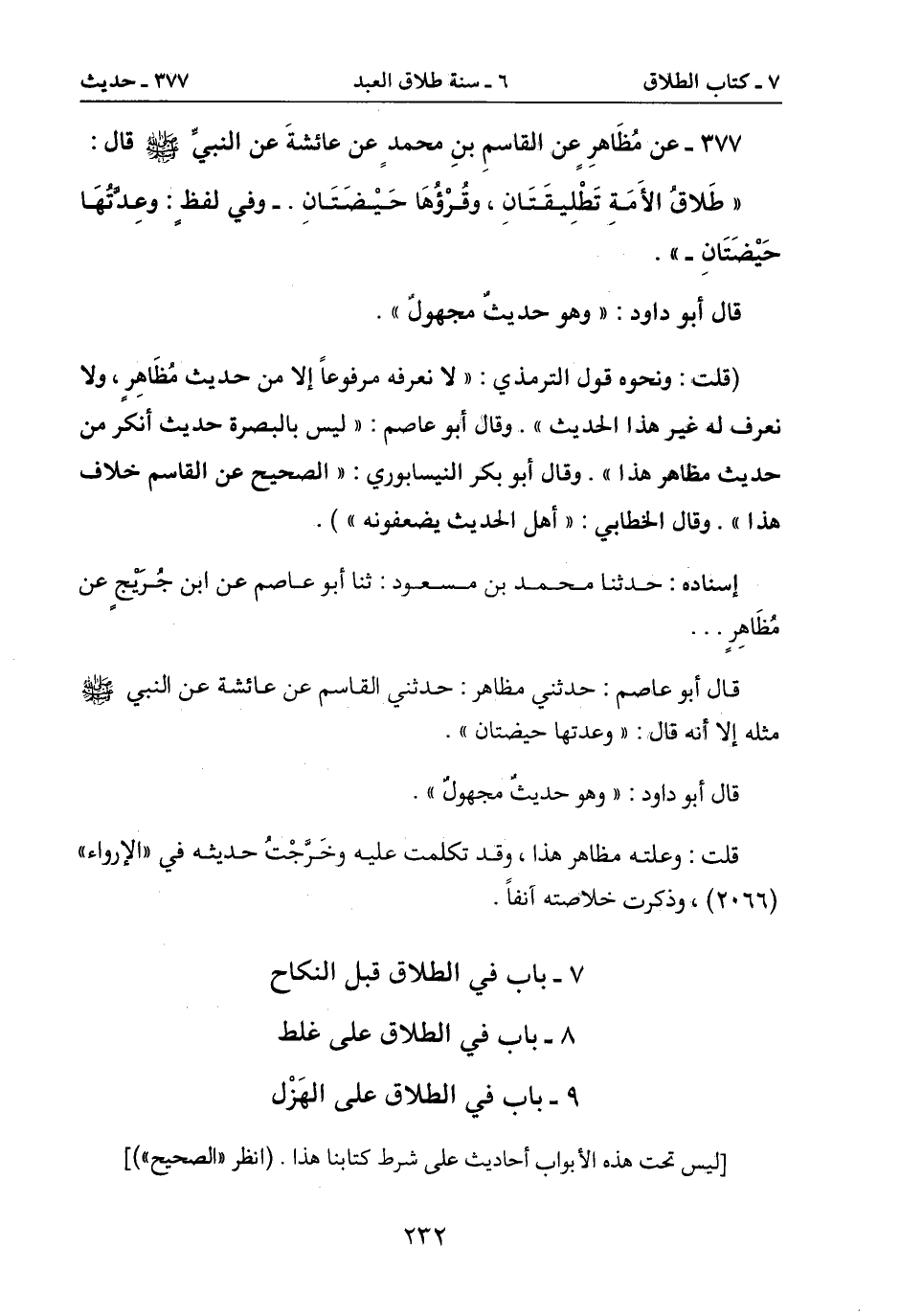 377- عن مظاهرِ عِن القاسمِ بنِ محمدٍ عن عائشة عن النبي صَلَّى اللَّهُ عَلَيْهِ وَسَلَّمَ قال: