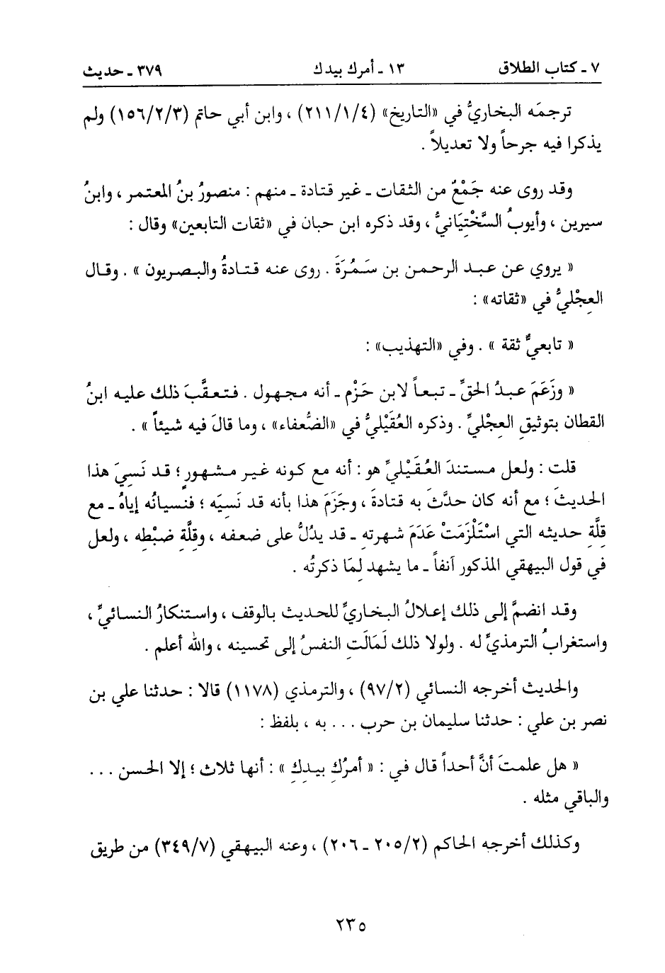 " هل علمت أنً أحدا قال في: " أمركِ بيدِكِ ": أنها ثلاث؛ إلا الحسن ...