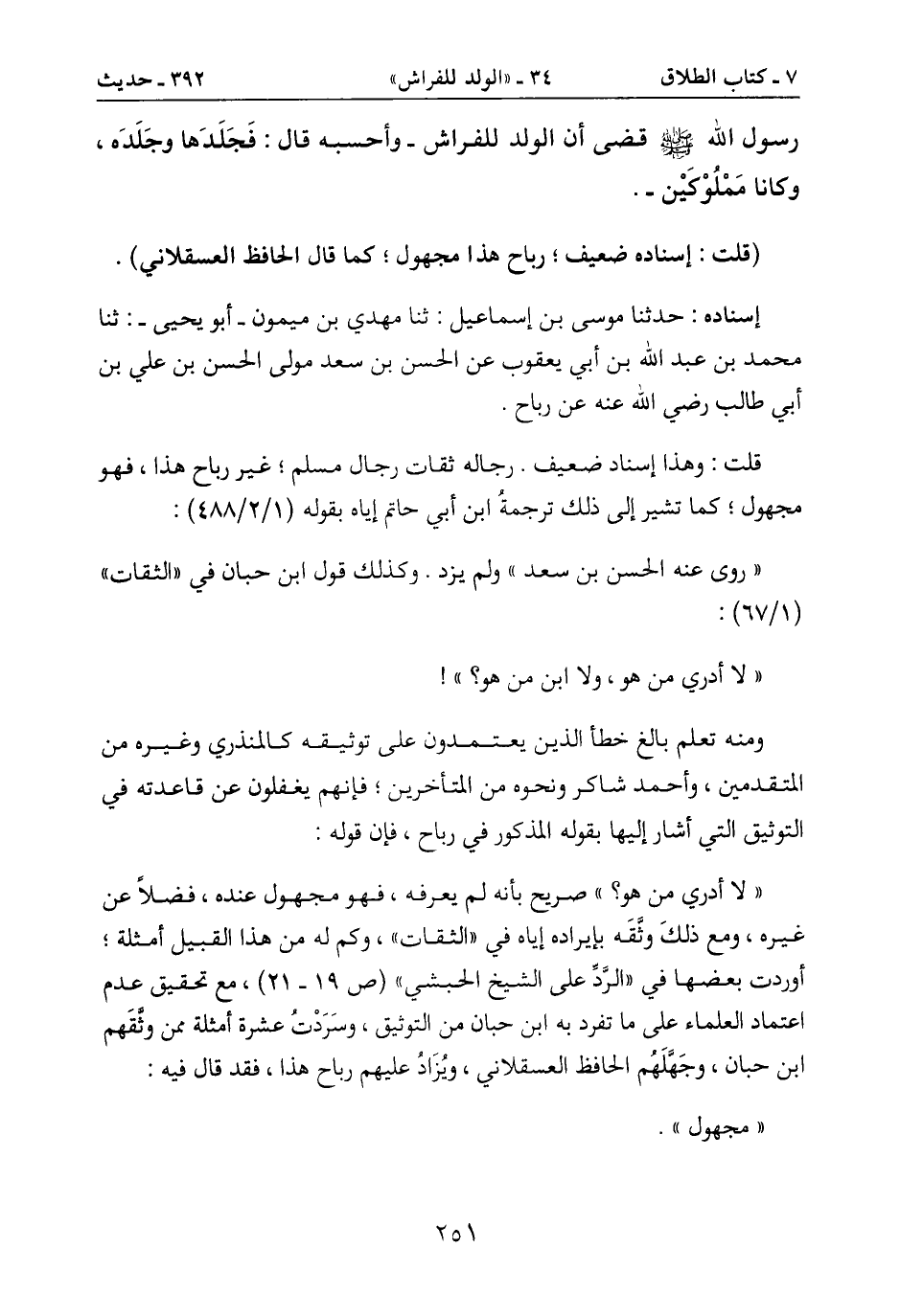 (قلت: إسناده ضعيف؛ رباح هذا مجهول؛ كما قال الحافظ العسقلاني) .