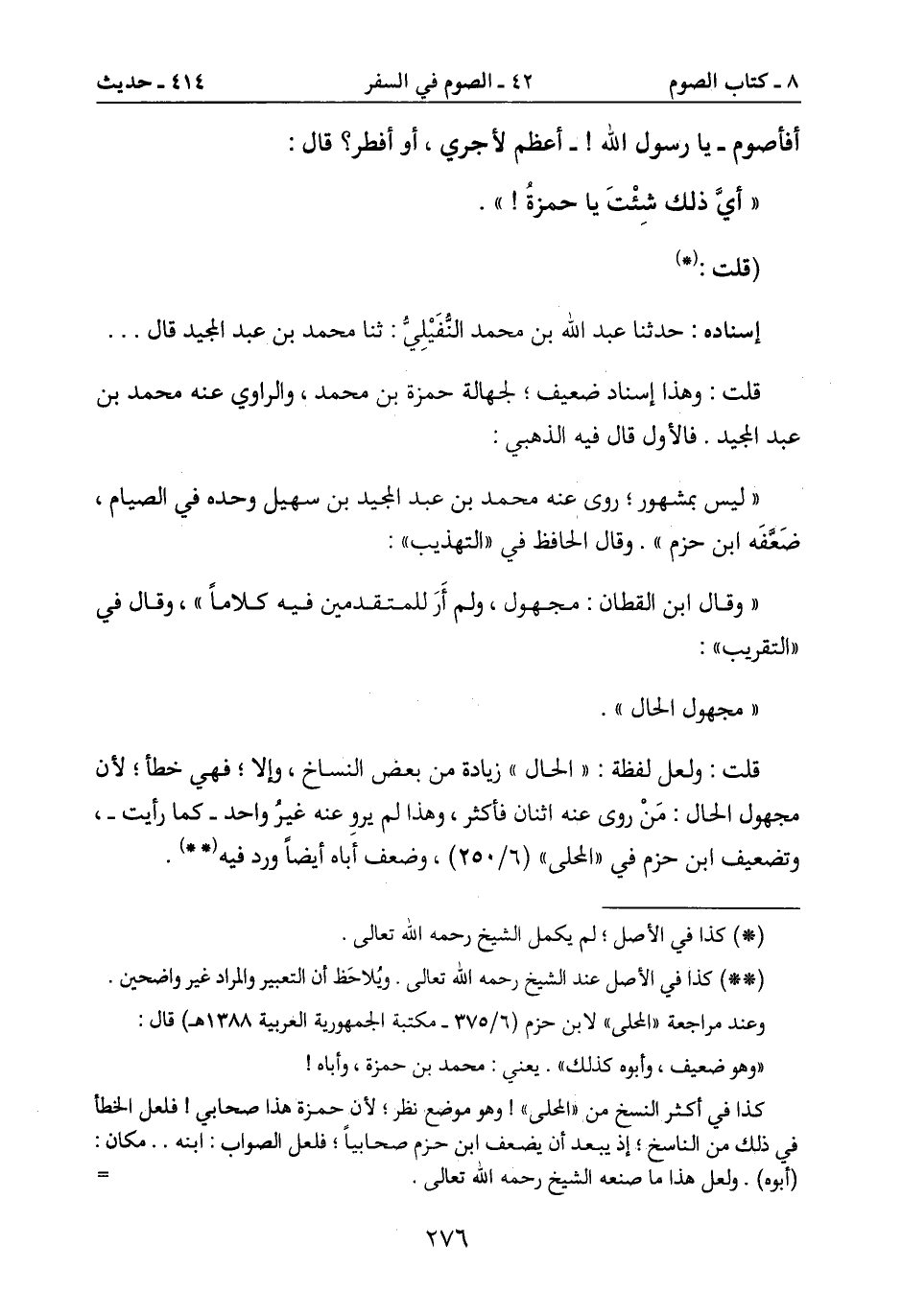كذا في أكثر النسخ من "المحلى"! وهو موضع نظر؛ لأن حمزة هذا صحابي! فلعل الخطأ