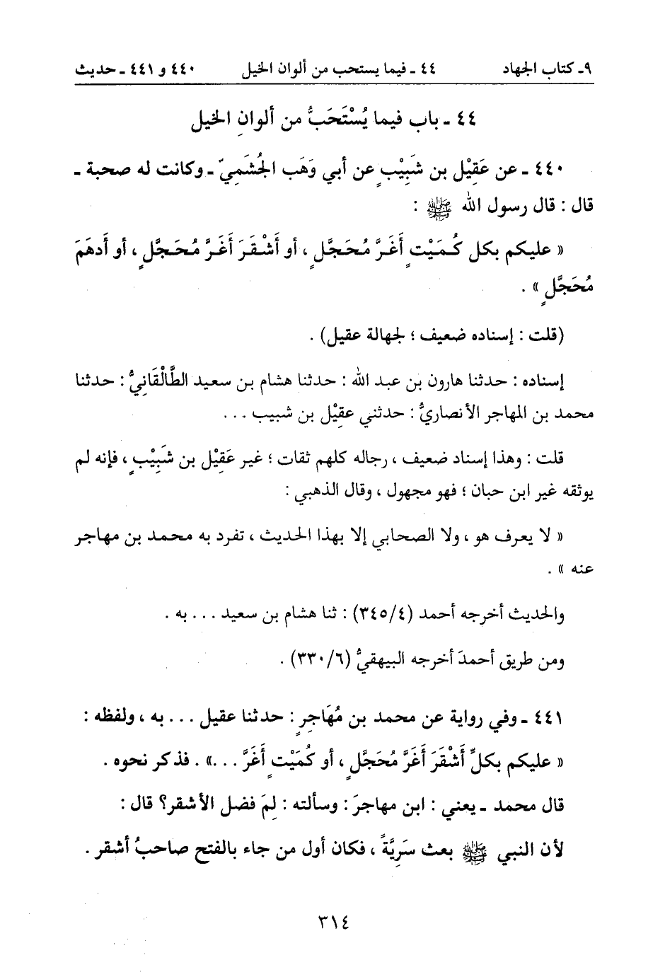 " عليكم بكلِّ أشْقر أغرّ مُحجّل، أو كميْتٍ أغرّ ... ". فذكر نحوه.