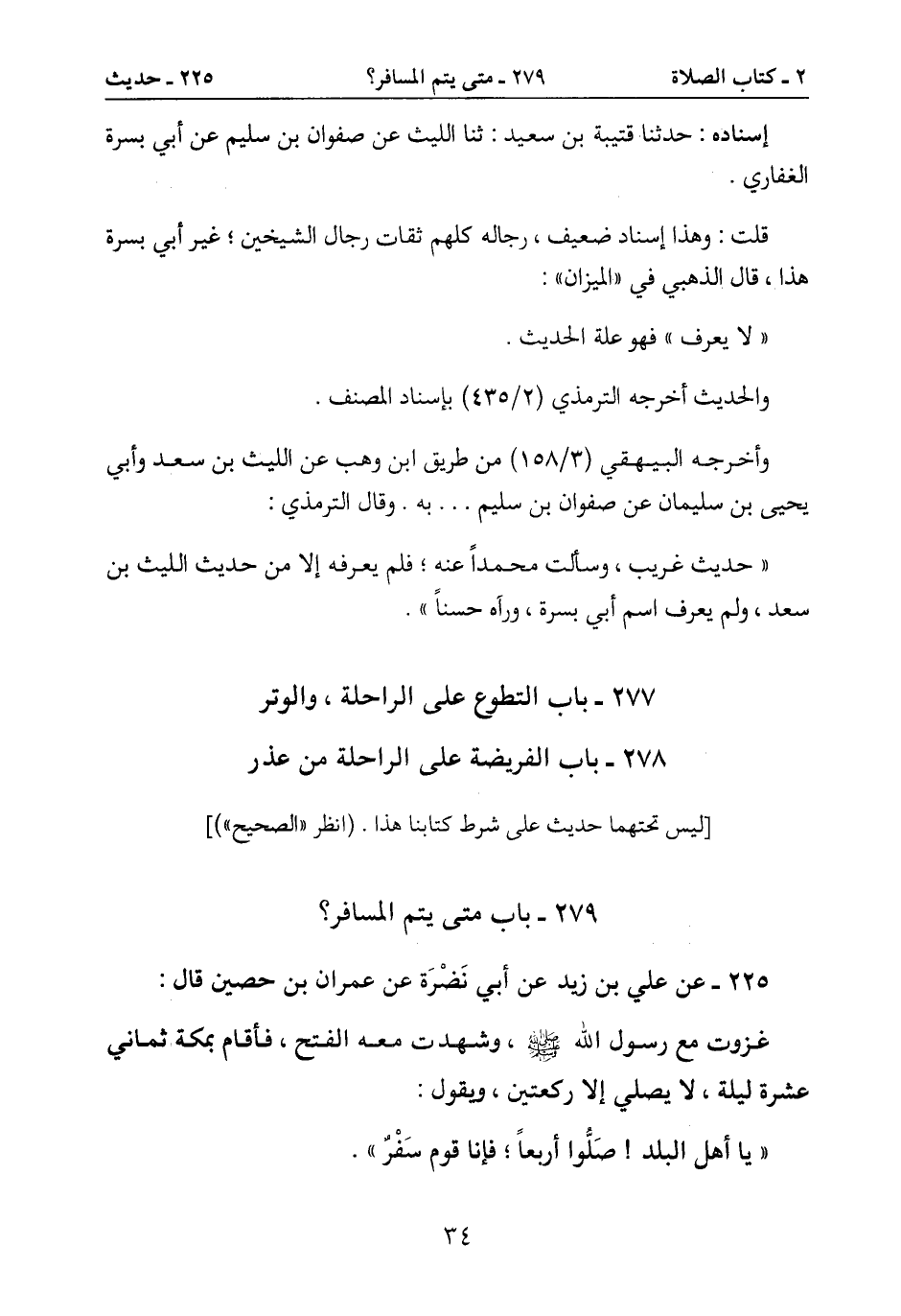 " يا أهل البلد! صلُّوا أربعاً؛ فإنا قوم سفْرٌ ".