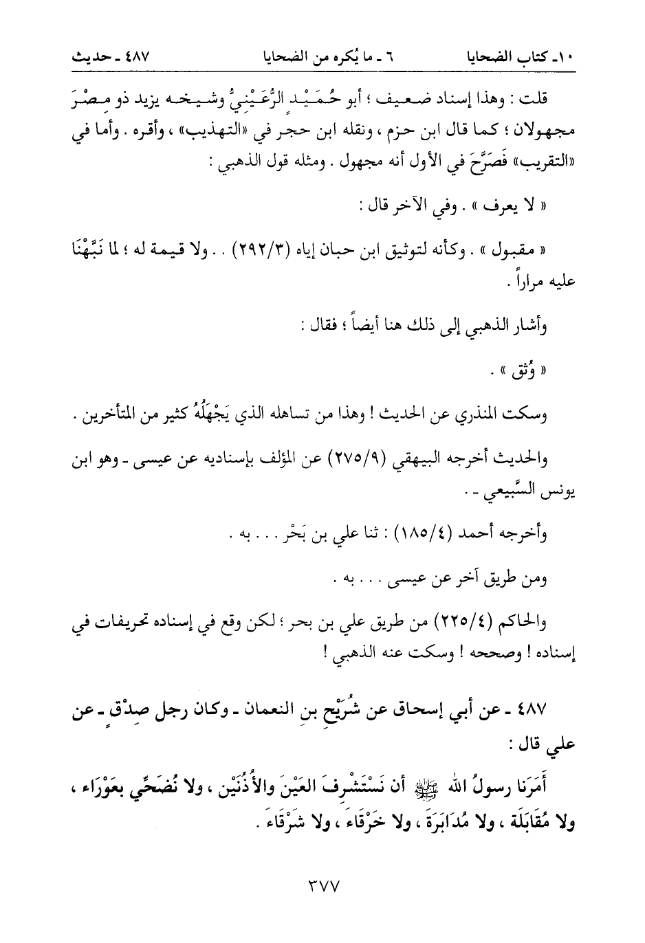 أمرنا رسولُ الله صَلَّى اللَّهُ عَلَيْهِ وَسَلَّمَ أن نسْتشْرِف العيْن والأُذُنيْن، ولا نُضحي بعوْراء،