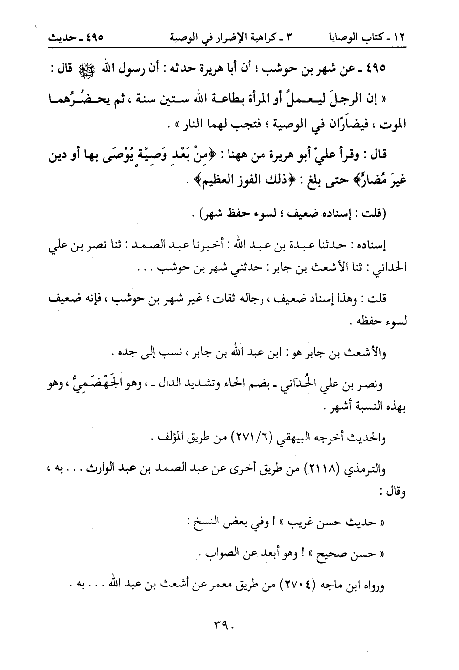 495- عن شهر بن حوشب؛ أن أبا هريرة حدثه: أن رسول الله صَلَّى اللَّهُ عَلَيْهِ وَسَلَّمَ قال: