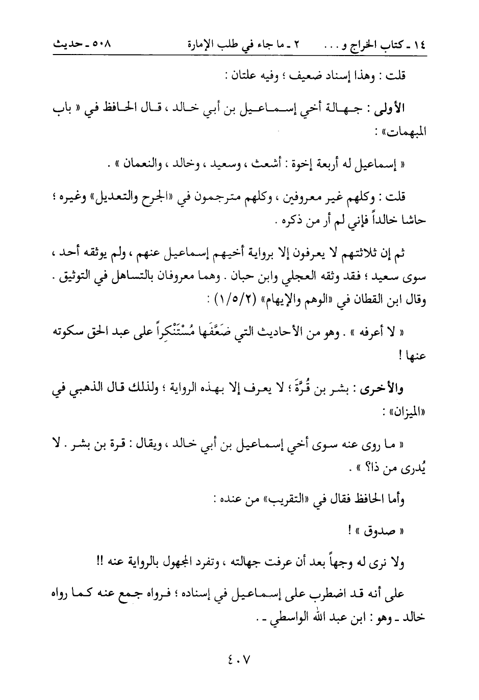 الأولى: جهالة أخي إسماعيل بن أبي خالد، قال الحافظ في " باب