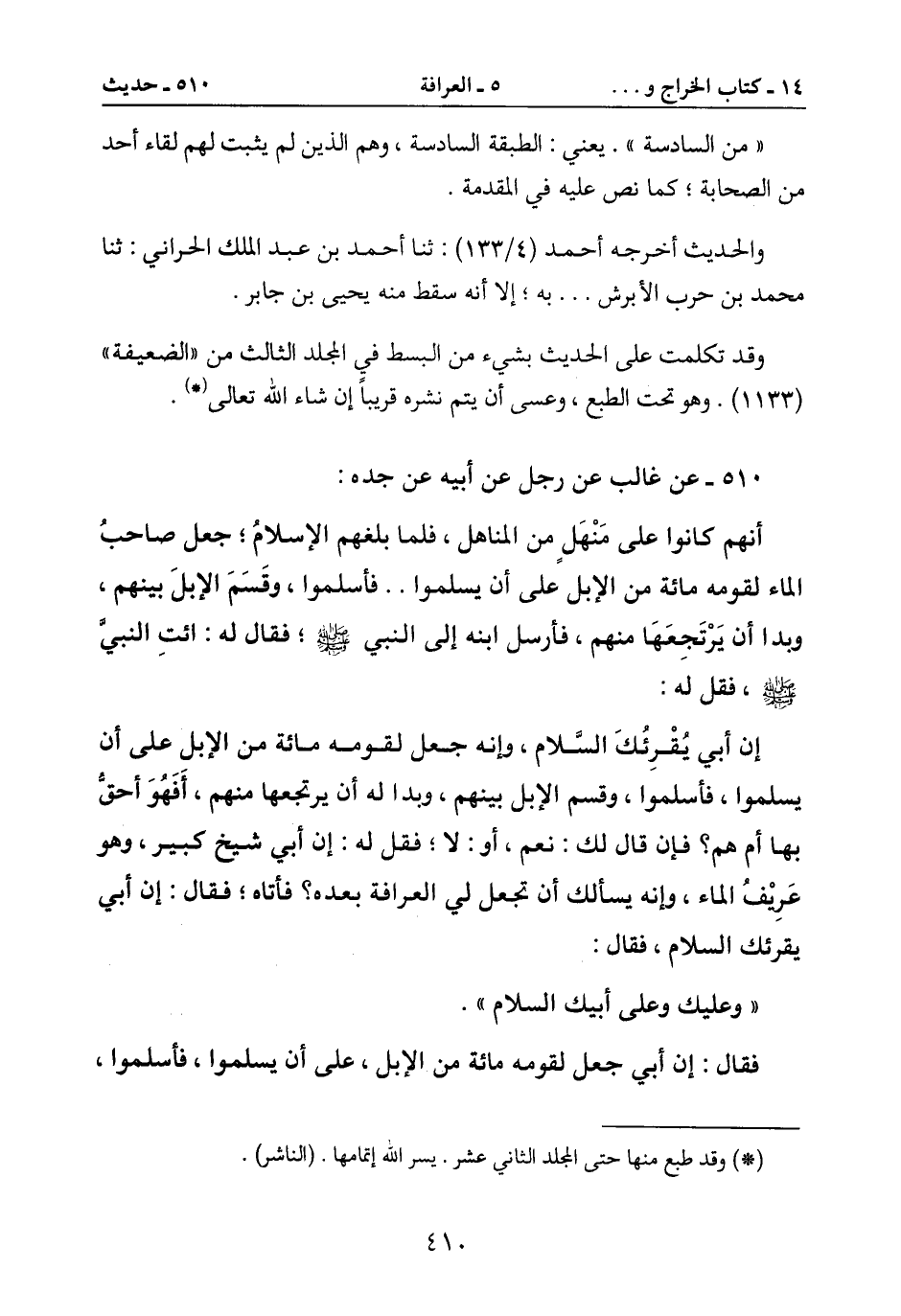 إن أبي يُقْرِئُك السّلام، وإنه جعل لقومه مائة من الابل على أن