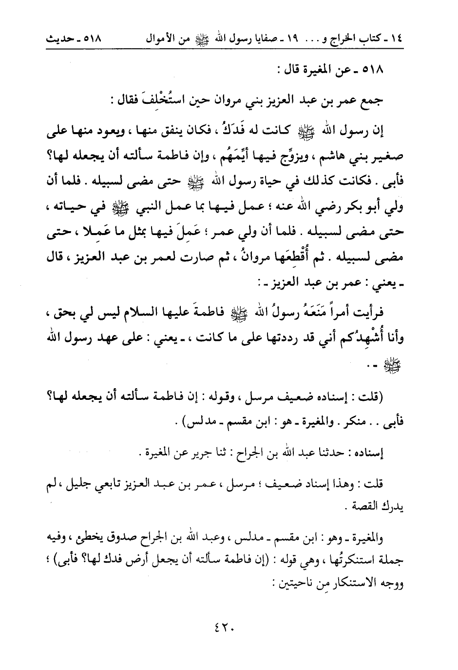 جملة استنكرتُها، وهي قوله: (إن فاطمة سألته أن يجعل أرض فدك لها؟ فأبى) ؛