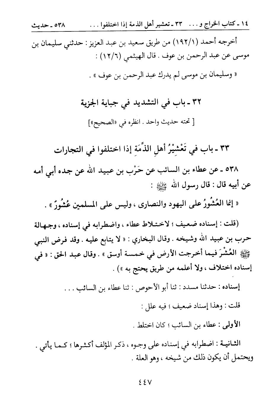 " إنما العُشُورُ على اليهود والنصارى، وليس على المسلمين عُشُورٌ ".