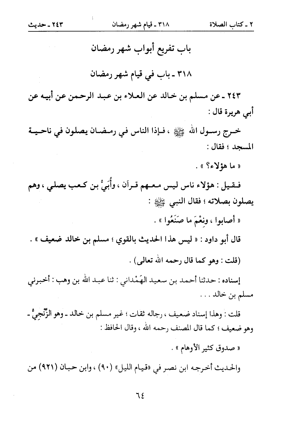 خرج رسول الله صَلَّى اللَّهُ عَلَيْهِ وَسَلَّمَ، فإذا الناس في رمضان يصلون في ناحية