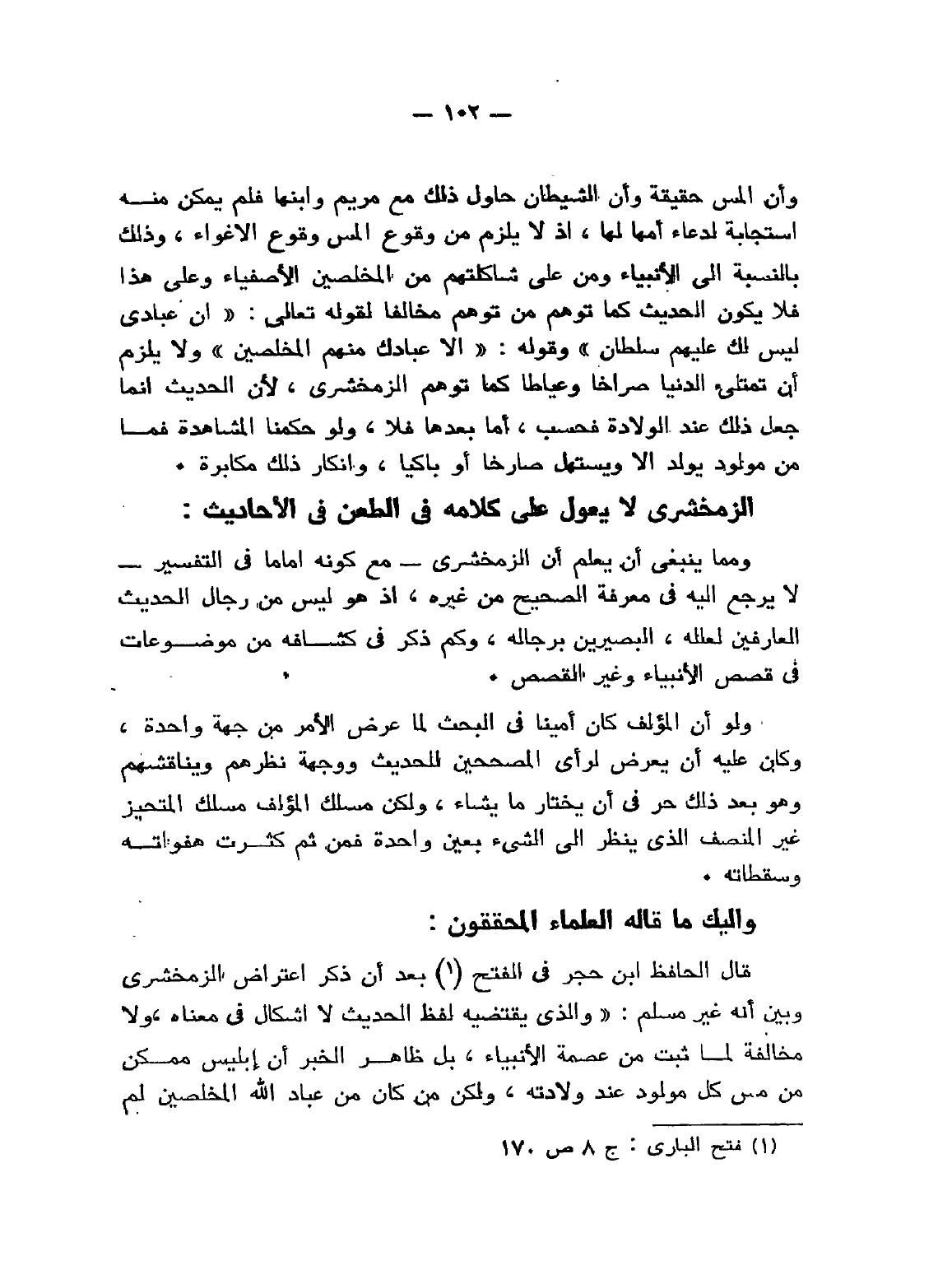 قال الحافظ ابن حجر في " الفتح " (¬3) بعد أَنْ ذكر اعتراض الزمخشري وَبَيَّنَ أنه غير مُسَلَّمٍ: «والذي يقتضيه لفظ الحديث لا إشكال في معناه، ولا مخالفة لما ثبت من عصمة الأنبياء، بل ظاهر الخبر أَنَّ إبليس ممكن من مَسِّ كل مولود عند ولادته، ولكن من كان من عباد الله المخلصين لم