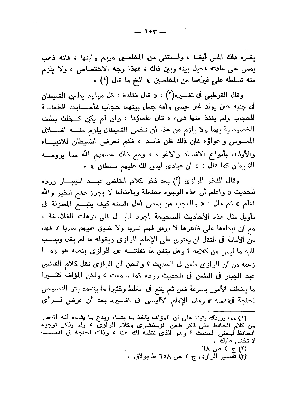 (¬1) مِمَّا يزيدك يقيناً على أنَّ المؤلف يأخذ ما يشاء ويدع ما يشاء أنه اقتصر من كلام الحافظ على ذكر طعن الزمخشري وكلام الرازي، ولم يذكر توجه الحافظ لمعنى الحديث، وهو الذي نقلته لك هنا، وذلك لحاجة في نفسه لا تخفى عليك.