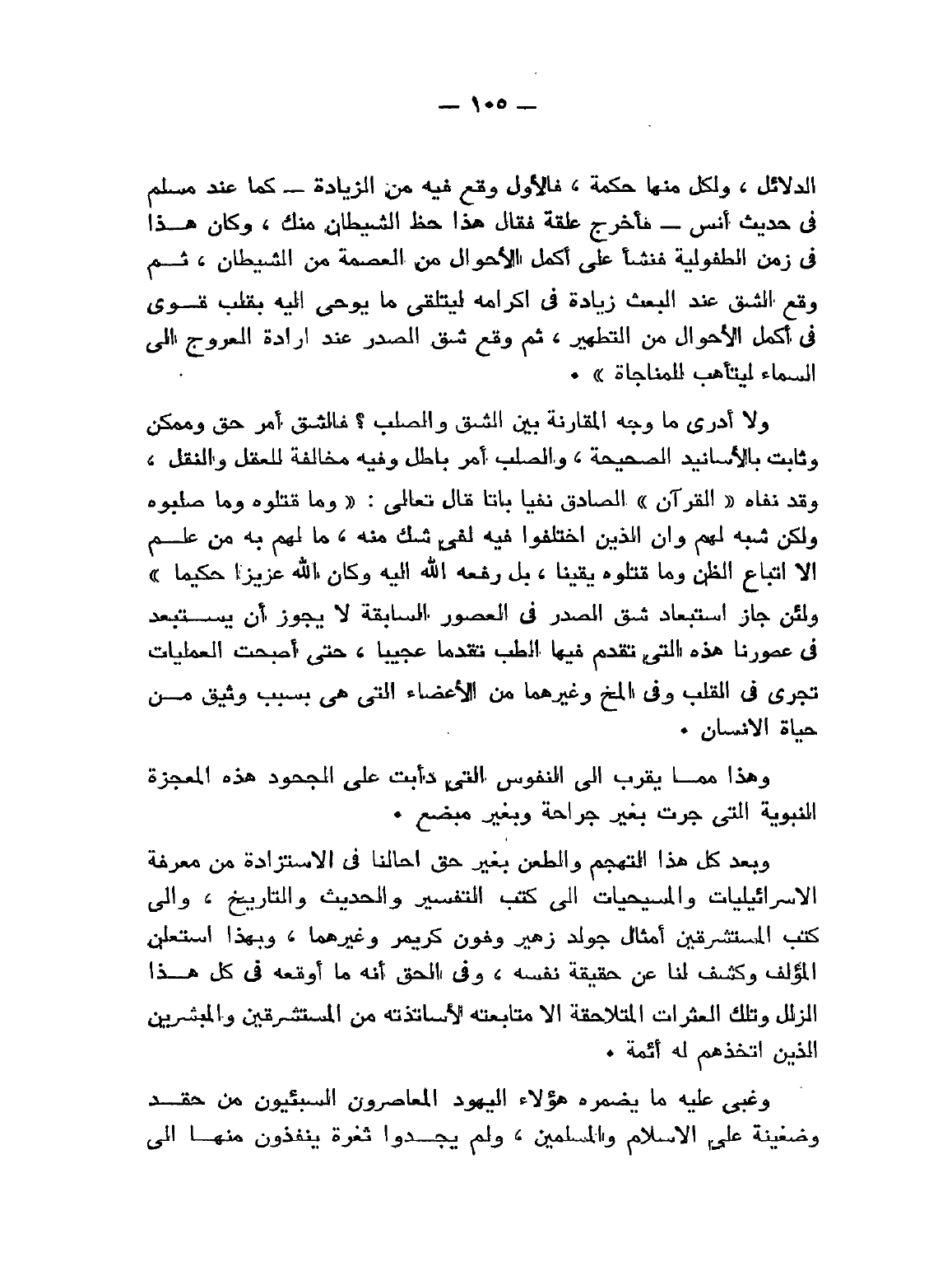 ولا أدري ما وجه المقارنة بين الشق والصلب؟ فالشق أمر حق وممكن وثابت بالأسانيد الصحيحة، والصلب أمر باطل وفيه مخالفة للعقل والنقل، وقد نفاه " القرآن " الصادق نفيًا بَاتًّا، قال تعالى: {وَقَوْلِهِمْ إِنَّا قَتَلْنَا الْمَسِيحَ عِيسَى ابْنَ مَرْيَمَ رَسُولَ اللَّهِ وَمَا قَتَلُوهُ وَمَا صَلَبُوهُ وَلَكِنْ شُبِّهَ لَهُمْ وَإِنَّ الَّذِينَ اخْتَلَفُوا فِيهِ لَفِي شَكٍّ مِنْهُ مَا لَهُمْ بِهِ مِنْ عِلْمٍ إِلاَّ اتِّبَاعَ الظَّنِّ وَمَا قَتَلُوهُ يَقِينًا، بَلْ رَفَعَهُ اللَّهُ إِلَيْهِ وَكَانَ اللَّهُ عَزِيزًا حَكِيمًا} (¬1). ولئن جاز استبعاد شق الصدر في العصور السابقة لا يجوز أَنْ يستبعد في عصورنا هذه التي تقدم فيها الطب تقدما عجيبا، حتى أصبحت العمليات تجري في القلب وفي المخ وغيرهما من الأعضاء التي هي بسبب وثيق من حياة الإنسان.