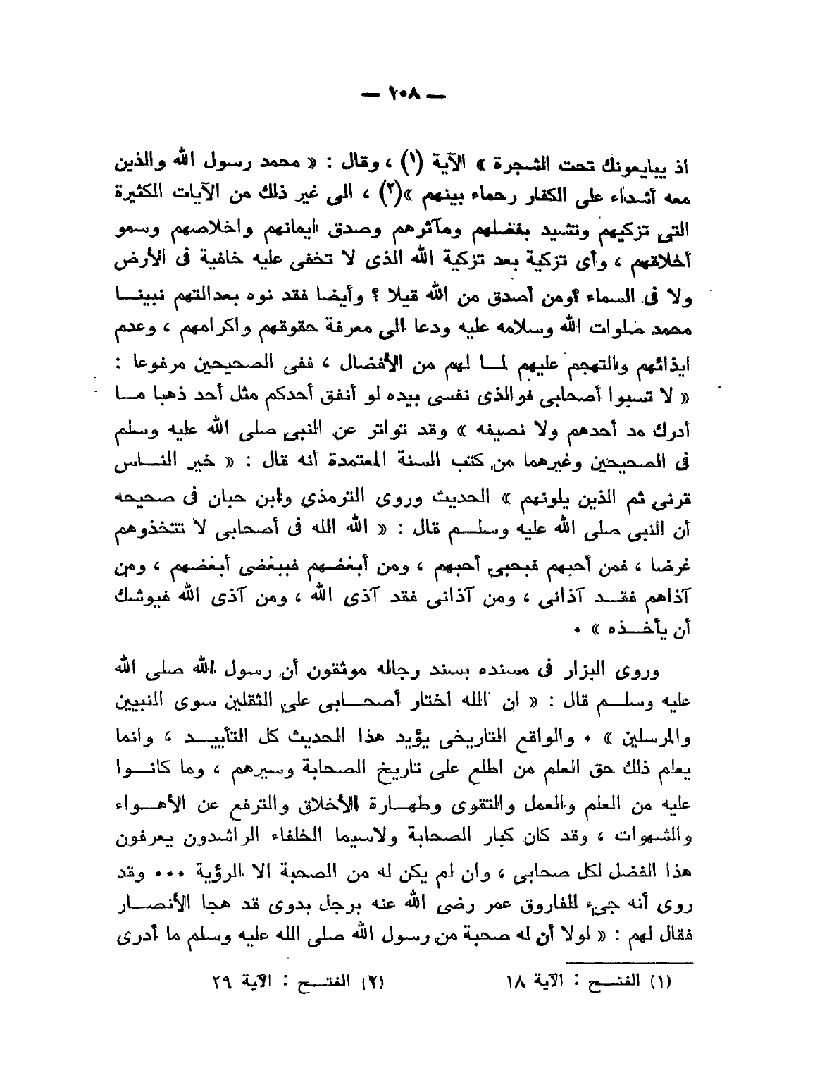 إِذْ يُبَايِعُونَكَ تَحْتَ الشَّجَرَةِ} (¬1) الآية، وقال: {مُحَمَّدٌ رَسُولُ اللَّهِ وَالَّذِينَ مَعَهُ أَشِدَّاءُ عَلَى الْكُفَّارِ رُحَمَاءُ بَيْنَهُمْ} (¬2)، إلى غير ذلك من الآيات الكثيرة التي تزكيهم وتشيد بفضلهم ومآثرهم وصدق إيمانهم وإخلاصهم وسمو أخلاقهم، وأي تزكية بعد تزكية الله الذي لا تخفى عليه خافية في الأرض ولا في السماء؟ ومن أصدق من الله قِيلاً؟ وأيضا فقد نَوَّهَ بعدالتهم نبينا محمد - صَلَوَاتُ اللهِ وَسَلاَمُهُ عَلَيْهِ - ودعا إلى معرفة حقوقهم وإكرامهم، وعدم إيذائهم والتهجم عليهم لما لهم من الأفضال، ففي " الصحيحين " مرفوعًا: «لاَ تَسُبُّوا أَصْحَابِي، فَوَالَّذِي نَفْسِي بِيَدِهِ، لَوْ أَنَّ أَحَدَكُمْ أَنْفَقَ مِثْلَ أُحُدٍ ذَهَبًا مَا أَدْرَكَ مُدَّ أَحَدِهِمْ وَلاَ نَصِيفَهُ». وقد تواتر عن النَّبِي - صَلََّى اللهُ عَلَيْهِ وَسَلَّمَ - في " الصحيحين " وغيرهما من كتب السُنَّة المعتمدة أنه قال: «خَيْرُ النَّاسِ قَرْنِي، ثُمَّ الَّذِينَ يَلُونَهُمْ»، الحديث. وروى الترمذي وابن حبان في " صحيحه " أن النَّبِي - صَلََّى اللهُ عَلَيْهِ وَسَلَّمَ - قال: «اللَّهَ اللَّهَ فِي أَصْحَابِي، لاَ تَتَّخِذُوهُمْ غَرَضًا بَعْدِي، فَمَنْ أَحَبَّهُمْ فَبِحُبِّي أَحَبَّهُمْ، وَمَنْ أَبْغَضَهُمْ فَبِبُغْضِي أَبْغَضَهُمْ، وَمَنْ آذَاهُمْ فَقَدْ آذَانِي، وَمَنْ آذَانِي فَقَدْ آذَى اللَّهَ، وَمَنْ آذَى اللَّهَ فَيُوشِكُ أَنْ يَأْخُذَهُ».