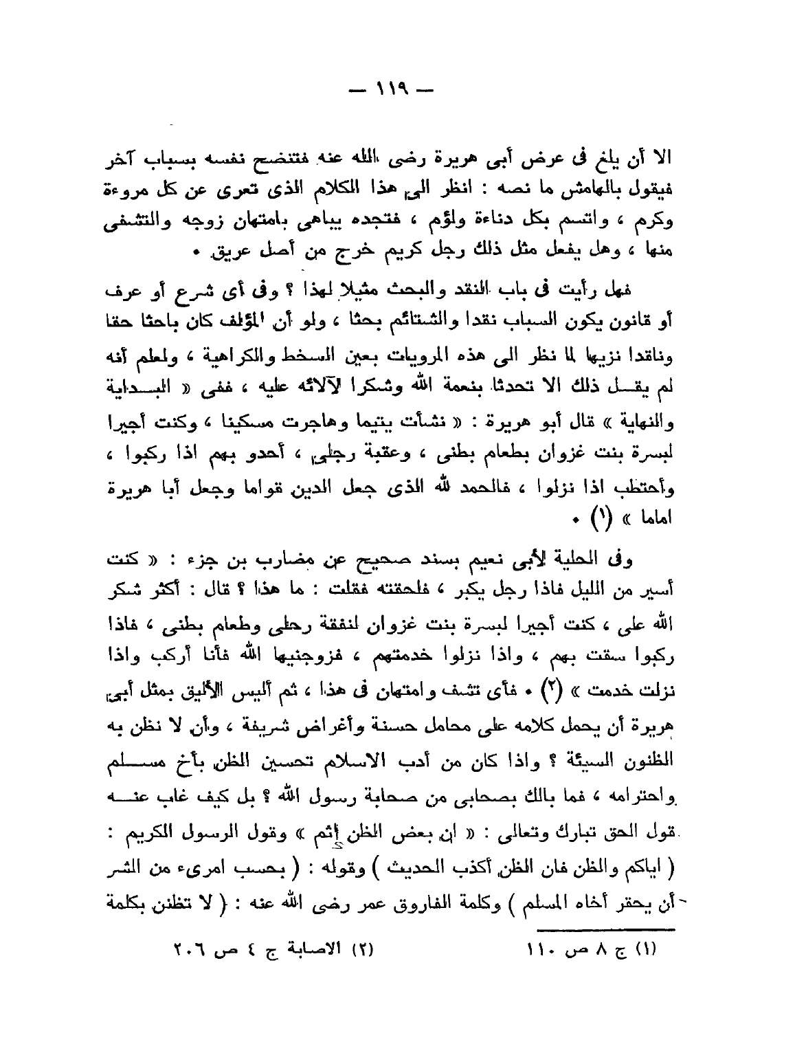 وفي " الحِلْيَةِ " لأبي نُعيم بسند صحيح عن مضارب بن جزء: «كُنْتُ أَسِيرُ مِنَ اللَّيْلِ فَإِذَا رَجُلٌ يُكَبِّرُ، فَلَحِقْتُهُ فَقُلْتُ: مَا هَذَا؟ قَالَ: أُكْثِرُ شُكْرَ اللهِ عَلَيَّ، كُنْتُ أَجِيرًا لِبُسْرَةَ بِنْتِ غَزْوَانَ لِنَفَقَةِ رَحْلِي وَطَعَامِ بَطْنِي، فَإِذَا رَكِبُوا سُقْتُ بِهِمْ، وَإِذَا نَزَلُوا خَدَمْتُهُمْ، فَزَوَّجَنِيهَا اللهُ فَأَنَا أَرْكَبُ وَإِذَا نَزَلْتُ خَدَمْتُ» (¬2). فأي تشف وامتهان في هذا، ثم أليس الأليق مثل أبي هريرة أن يحمل كلامه على محامل حسنة وأغراض شريفة، وأن لا نظن به الظنون السيئة؟ وإذا كان من أدب الإسلام تحسين الظن بأي أخ مسلم واحترامه، فما بالك بصحابي من صحابة رسول الله؟ بل كيف غاب عنه قول الحق تبارك وتعالى: {إِنَّ بَعْضَ الظَّنِّ إِثْمٌ} (¬3)