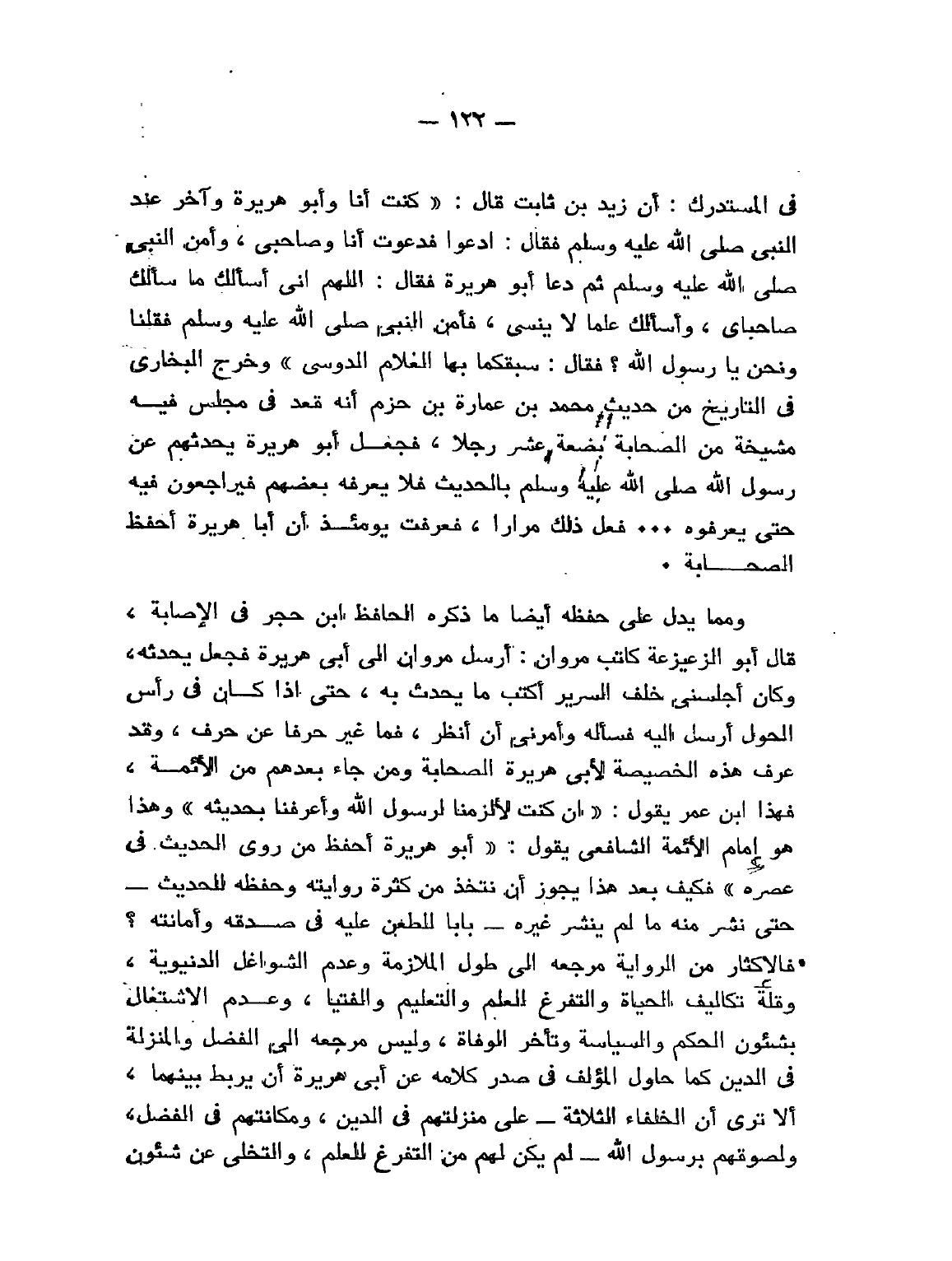 وَمِمَّا يدل على حفظه أيضا ما ذكره الحافظ ابن حجر في " الإصابة "، قَالَ أَبُو الزُّعَيْزِعَةِ كَاتِبُ مَرْوَانَ: «أَرْسَلَ مَرْوَانُ إِلَى أَبِي هُرَيْرَةَ فَجَعَلَ يُحَدِّثُهُ، وَكَانَ أَجْلَسَنِي خَلْفَ السَّرِيرِ أَكْتُبُ مَا يُحَدِّثُ بِهِ، حَتَّى إِذَا كَانَ فِي رَأْسِ الحَوْلِ أَرْسَلَ إِلَيْهِ فَسَأَلَهُ وَأَمَرَنِي أَنْ أَنْظُرَ، فَمَا غَيَّرَ حَرْفًا عَنْ حَرْفٍ»، وقد عرف هذه الخصيصة لأبي هريرة الصحابة ومن جاء بعدهم من الأئمة، فهذا ابن عمر يقول: «إِنْ كُنْتَ لأَلْزَمَنَا لِرَسُولِ اللهِ وَأَعْرَفَنَا بِحَدِيثِهِ» وهذا هو إمام الأئمة الشافعي يقول: «أَبُو هُرَيْرَة أَحْفَظ مَنْ رَوَى الْحَدِيث فِي عَصْره» فكيف بعد هذا يجوز أن نتخذ من كثرة روايته وحفظه للحديث - حتى نشر منه ما لم ينشر غيره - بَابًا للطعن عليه في صدقه وأمانته؟ فالإكثار من الرواية مرجعه إلى طول الملازمة وعدم الشواغل الدنيوية، وقلة تكاليف الحياة والتفرغ للعلم والتعليم والفتيا، وعدم الاشتغال بشؤون الحُكْمِ والسياسة وتأخر الوفاة، وليس مرجعه إلى الفضل والمنزلة في الدين كما حاول المؤلف في صدر كلامه عن أبي هريرة أن يربط بينهما، ألا ترى إلى الخلفاء الثلاثة - على منزلتهم في الدين، ومكانتهم في الفضل ولصوقهم برسول الله لم يكن لهم من التفرغ للعلم، والتخلي عن شؤون