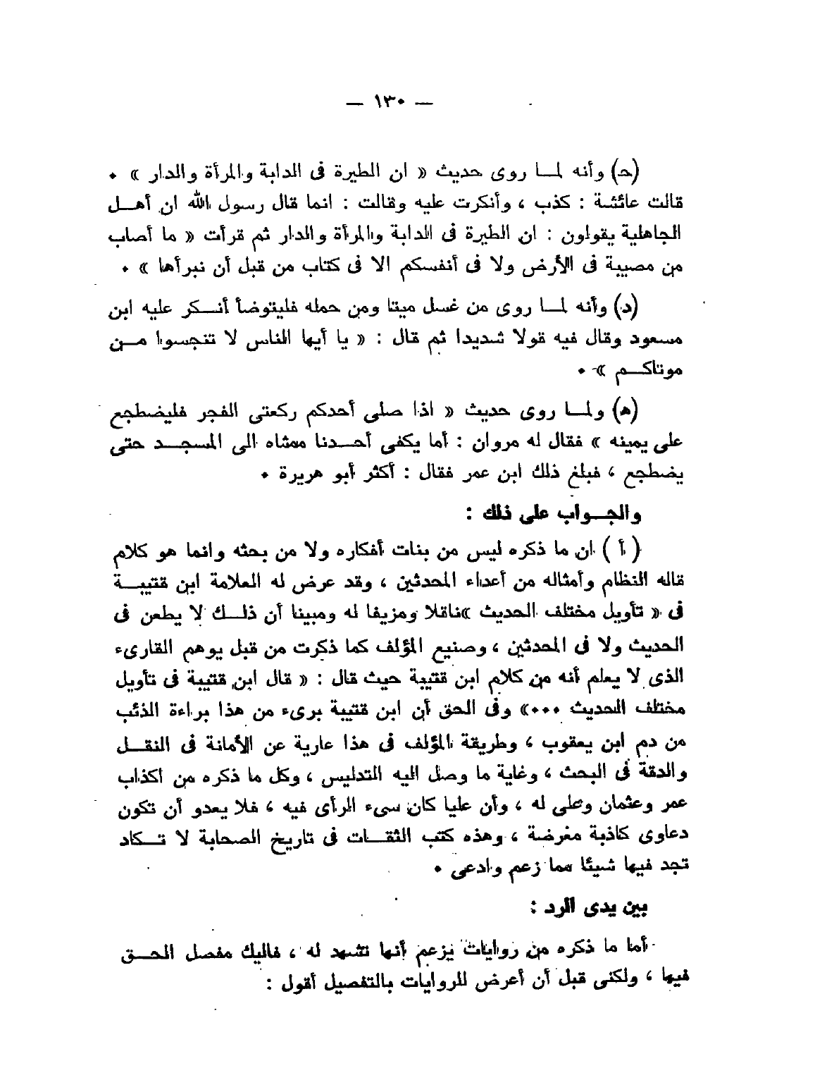 أ) إن ما ذكره ليس من بنات أفكاره ولا من بحثه وإنما هو كلام قاله النَظَّامِ وأمثاله من أعداء المُحَدِّثِينَ، وقد عرض له العَلاَّمَةُ ابن قتيبة في " تأويل مختلف الحديث " ناقلاً وَمُزَيِّفًا لَهُ وَمُبَيِّنًا أن ذلك لا يطعن في الحديث ولا في المُحَدِّثِينَ، وصنيع المؤلف كما ذكرت من قبل يوهم القارئ الذي لا يعلم أنه من كلام ابن قتيبة حيث قال: «قال ابن قتيبة في تأويل مختلف الحديث .... » وفي الحق أن ابن قتيبة بريء من هذا براءة الذئب من دم ابن يعقوب، وطريقة المؤلف في هذا عارِيةَ عن الأمانة في النقل والدقة في البحث، وغاية ما وصل إليه التدليس، وكل ما ذكره من إكذاب عمر وعثمان وَعَلِيٍّ له، وأن عَلِيًّا كان سيئ الرأي فيه، فلا يعدو أن تكون دعاوى كاذبة مغرضة، وهذه كتب الثقات في تاريخ الصحابة لا تكاد تجد فيها شيئا مِمَّا زعم وَادَّعَى.