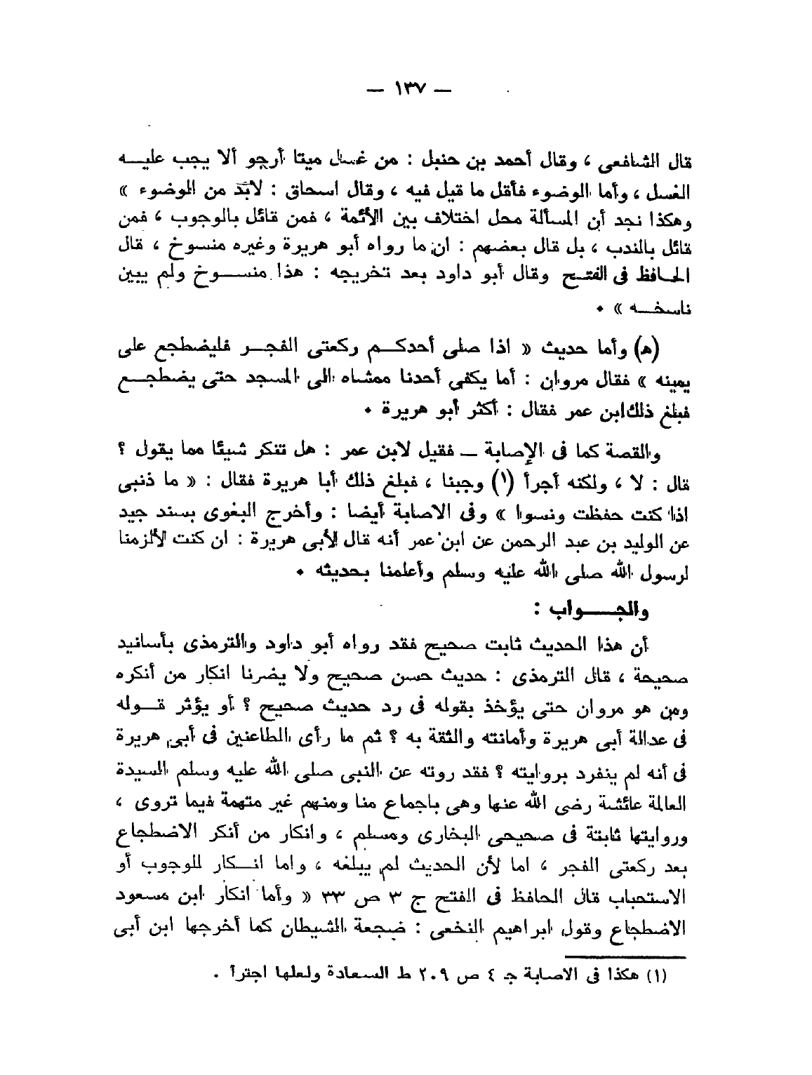 أن هذا الحديث ثابت صحيح فقد رواه أبو داود والترمذي بأسانيد صحيحة، قال الترمذي: «حَدِيثٌ حَسَنٌ صَحِيحٌ». ولا يضرنا إنكار من أنكره ومن هو مروان حتى يأخذ بقوله في رَدِّ حديث صحيح؟ أو يؤثر قوله في عدالة أبي هريرة وأمانته والثقة به؟ ثم ما رأى الطاعنين في أبي هريرة في أنه لم ينفرد بروايته؟ فقد روته عن النَّبِيِّ - صَلََّى اللهُ عَلَيْهِ وَسَلَّمَ - السيدة العالمة عائشة - رَضِيَ اللهُ عَنْهَا - وهي بإجماع منا ومنهم غير متهمة فيما تروي، وروايتها ثابتة في " صحيحي البخاري ومسلم "، وإنكار من أنكر الاضطجاع بعد ركعتي الفجر، إما لأن الحديث لم يبلغه، وإما إنكار للوجوب أو الاستحباب قال الحافظ في " الفتح " ج 3 ص 33: «وَأَمَّا إِنْكَار اِبْن مَسْعُود الاِضْطِجَاع، وَقَوْل إِبْرَاهِيم النَّخَعِيِّ: "هِيَ ضِجْعَة الشَّيْطَان " كَمَا أَخْرَجَهُمَا اِبْن أَبِي