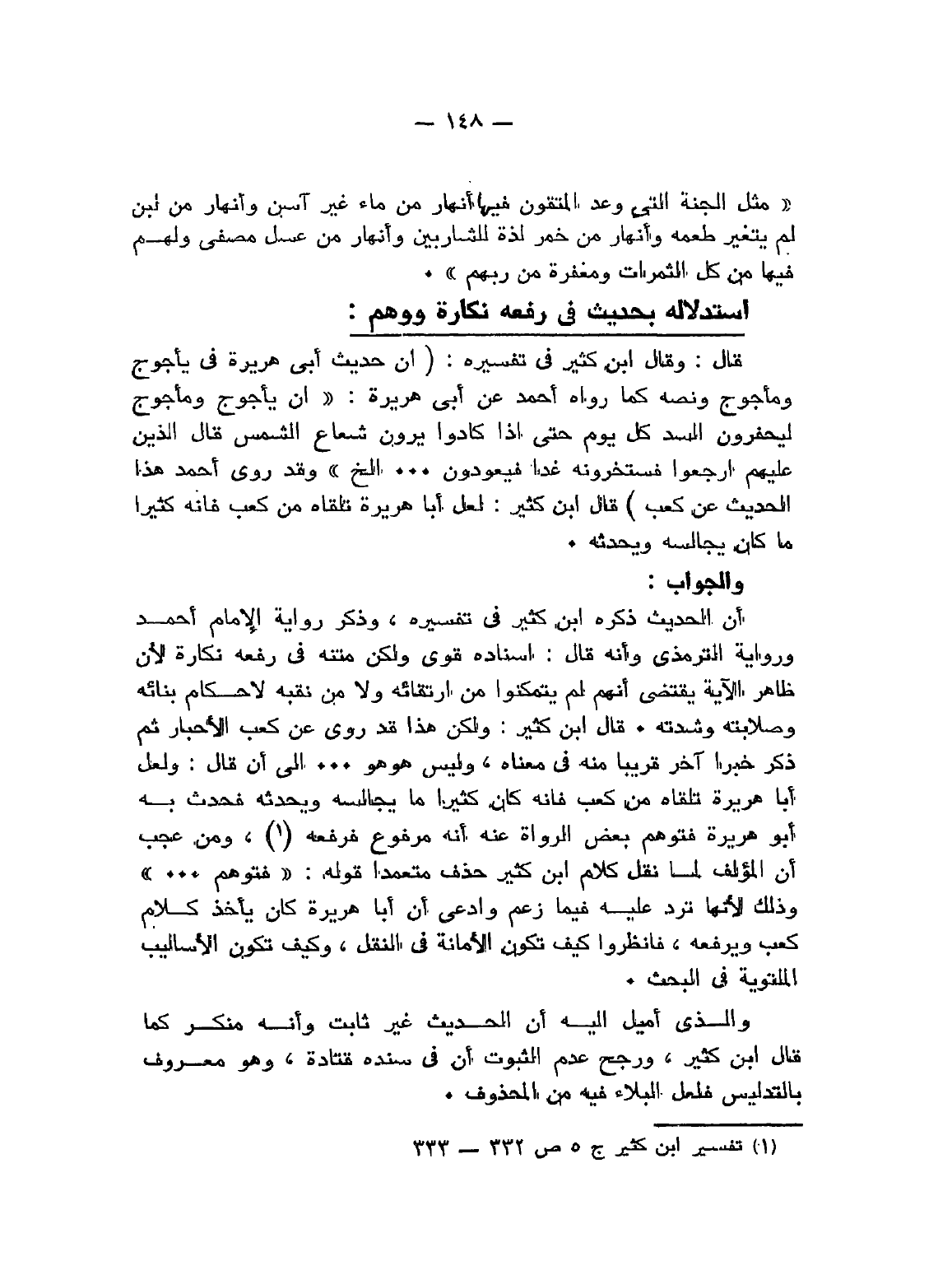 قال ابن كثير: ولكن هذا قد روي عن كعب الأحبار ثم ذكر خبرًا آخر قريبًا منه في معناه، وليس هو هو ... إلى أن قال: ولعل أبا هريرة تلقاه من كعب فإنه كان كثيرًا ما يجالسه وَيُحَدِّثُهُ فَحَدَّثَ به أبو هريرة فتوهم بعض الرواة عنه أنه مرفوع فرفعه (¬2)، ومن عجب أن المؤلف لما نقل كلام ابن كثير حذف متعمدًا قوله: «فَتَوَهَّمَ ... » وذلك لأنها ترد عليه فيما زعم وادعى أن أبا هريرة كان يأخذ كلام كعب ويرفعه، فانظروا كيف تكون الأمانة في النقل، وكيف تكون الأساليب الملتوية في البحث.
