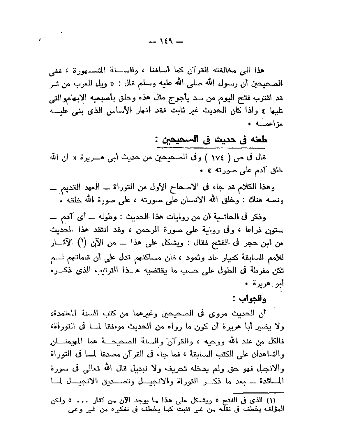 قال في [ص 174] وفي " الصحيحين " من حديث أبي هريرة «إِنَّ اللَّهَ خَلَقَ آدَمَ عَلَى صُورَتِهِ».