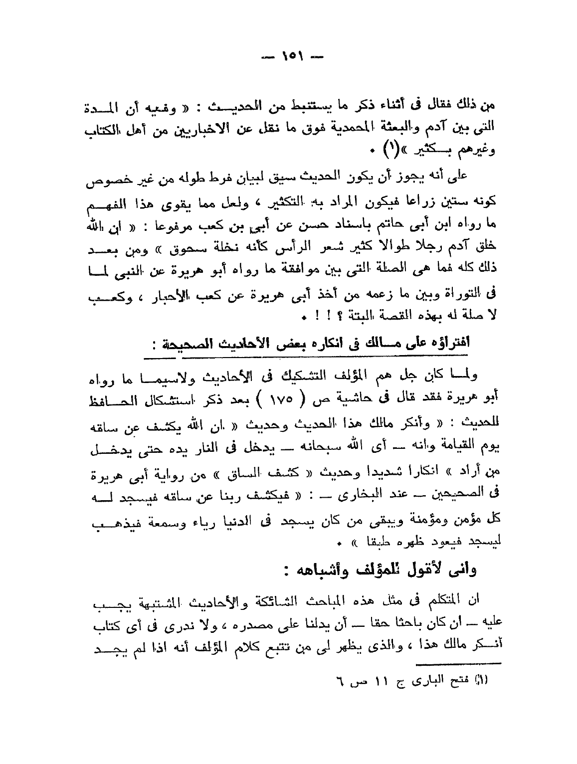 ولما كان جُلُّ هَمِّ المؤلف التشكيك في الأحاديث ولا سيما ما رواه أبو هريرة فقد قال في حاشية [ص 175] بعد استشكال الحافظ للحديث: وأنكر مالك هذا الحديث وحديث «إِنَّ اللهَ يَكْشِفُ عَنْ سَاقِهِ يَوْمَ القِيَامَةِ وَإنه - أي الله سبحانه - يدخل في النار يده حتى يدخل من أراد» إنكارًا شديدًا وحديث «كشف الساق» من رواية أبي هريرة في " الصحيحين " - عند البخاري - «فَيَكْشِفُ رَبُّنَا عَنْ سَاقِهِ، فَيَسْجُدُ لَهُ كُلُّ مُؤْمِنٍ وَمُؤْمِنَةٍ وَيَبْقَى مَنْ كَانَ يَسْجُدُ فِي الدُّنْيَا رِيَاءً وَسُمْعَةً، فَيَذْهَبُ لِيَسْجُدَ فَيَعُودُ ظَهْرُهُ طَبَقًا».