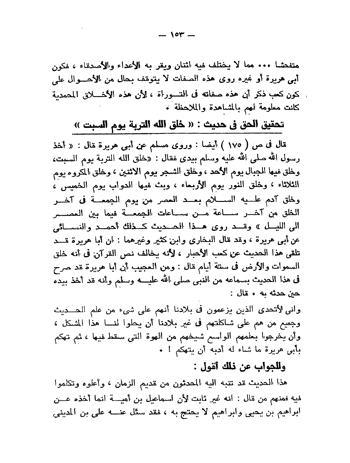 وقد روى هذا الحديث كذلك أحمد والنسائي عن أبي هريرة، وقد قال البخاري وابن كثير وغيرهما: إن أبا هريرة قد تلقى هذا الحديث عن كعب الأحبار، لأنه يخالف نص القرآن في أنه خلق السماوات والأرض في ستة أيام قال: ومن العجيب أن أبا هريرة قد صرح في هذا الحديث بسماعه من النَّبِي - صَلََّى اللهُ عَلَيْهِ وَسَلَّمَ - وأنه قد أخذ بيده حين حدثه به. قال: وإني لأتحدى الذين يزعمون في بلادنا أنهم على شيء من علم الحديث وجميع من هم على شاكلتهم في غير بلادنا أَنْ يُحِلُّوا لنا هذا المشكل، وأن يخرجوا بعلمهم الواسع شيخهم من الهوة التي سقط فيها ثم تَهَكَّمَ بأبي هريرة ما شاء له أدبه أن يتهكم!.
