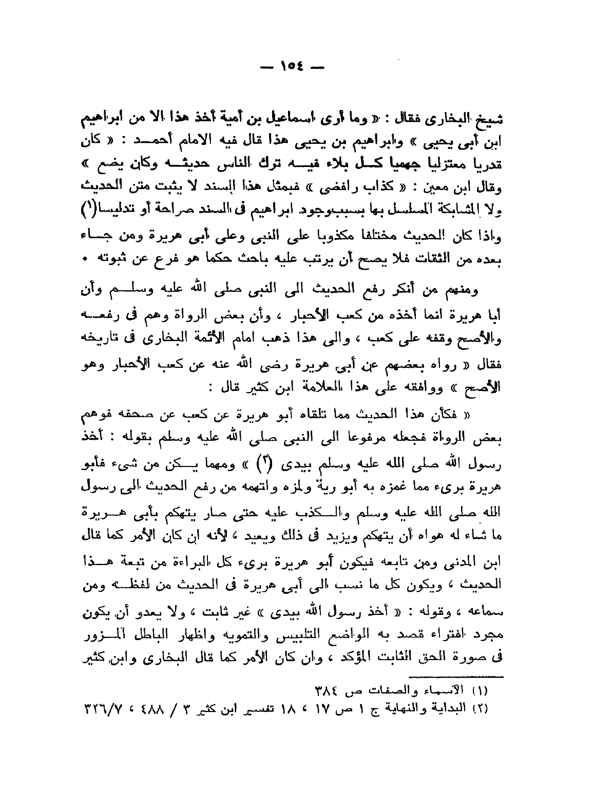 شيخ البخارى فقال: «وَمَا أَرَى إِسْمَاعِيلَ بْنَ أُمَيَّةَ أَخَذَ هَذَا إِلاَّ مِنْ إِبْرَاهِيمَ بْنَ أَبِي يَحْيَى» وإبراهيم بن [أبي] يحيى هذا قال فيه الإمام أحمد «كَانَ قَدَرِيًّا مُعْتَزِلِيًّا جَهْمِيًّا، كُلُّ بَلاَءٍ فِيهِ تَرَكَ النَّاسُ حَدِيثَهُ وَكَانَ يَضَعُ» وقال ابن معين: «كَذَّابٌ رَافِضِيٌّ» فبمثل هذا السند لا يثبت متن الحديث ولا المشابكة المسلسل بها بسبب وجود إبراهيم في السند صراحة أو تدليسًا (¬1) وإذا كان الحديث [مُخْتَلَقًا] مكذوبًا على النَّبِي وعلى أبي هريرة ومن جاء بعده من الثقات فلا يصح أن يرتب عليه باحث حُكْمًا هو فرع عن ثبوته.