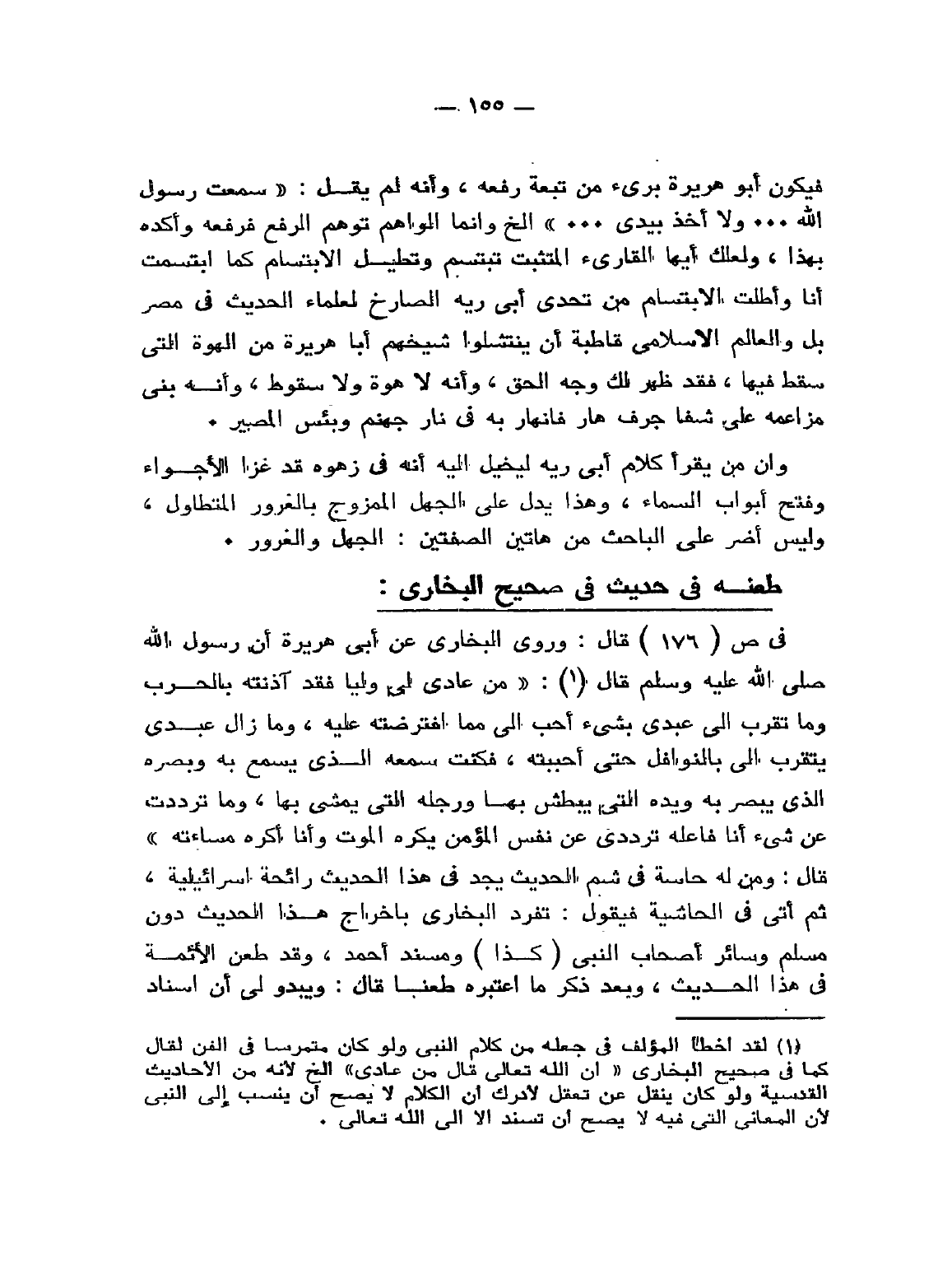 (¬1) لَقَدْ أَخْطَأَ المُؤَلِّفُ فِي جَعْلِهِ مِنْ كَلاَمِ النَّبِيِّ وَلَوْ كَانَ مُتَمَرِّسًا فِي الفَنِّ لَقَالَ كَمَا فِي " صَحِيحِ البُخَارِيِّ ": «إِنَّ اللهَ تَعَالَى قَالَ: مَنْ عَادَى» إلخ ... لأَنَّهُ مِنَ الأَحَادِيثِ القُدْسِيَّةِ وَلَوْ كَانَ يَنْقُلُ عَنْ تَعَقُّلٍ لأَدْرَكَ أَنَّ الكَلاَمَ لاَ يَصِحُّ أَنْ يُنْسَبَ إِلَى النَّبِيِّ لأَنَّ المَعَانِي التِي فِيهِ لاَ يَصِحُّ أنْ تُسْنَدَ إِلاَّ إِلَى اللهِ تَعَالَى.