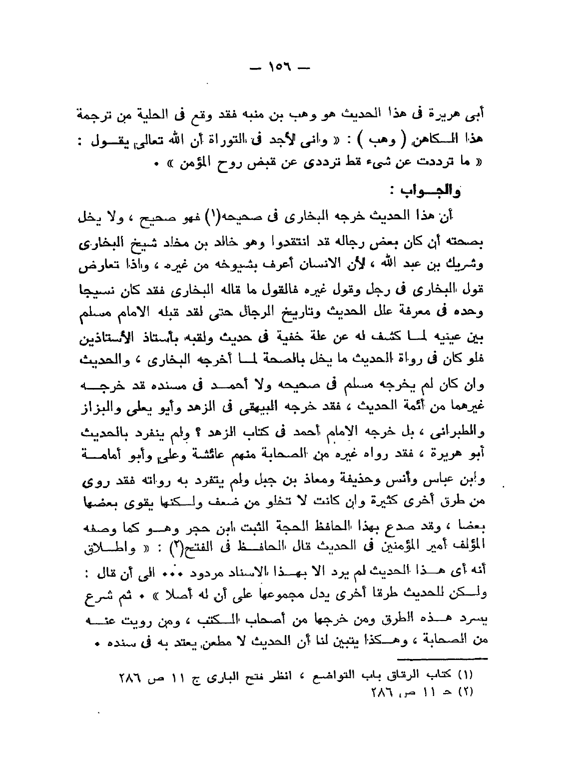 أن هذا الحديث خرجه البخاري في " صحيحه " (¬1) فهو صحيح، ولا يخل بصحته أن كان بعض رجاله قد انتقدوا وهو خالد بن مخلد شيخ البخارى وشريك بن عبد الله، لأن الإنسان أعرف بشيوخه من غيره، وإذا تعارض قول البخاري في رجل وقول غيره فالقول ما قاله البخاري فقد كان نسيج وحده في معرفة علل الحديث وتاريخ الرجال حتى لقد قَبَّلَهُ الإمام مسلم بين عينيه لما كشف له عن علة خفية في حديث ولقبه بأستاذ الأستاذين فلو كان في رواة الحديث ما يخل بالصحة لما أخرجه البخاري، والحديث وإن كان لم يخرجه مسلم في " صحيحه " ولا أحمد في " مسنده " قد خرجه غيرهما من أئمة الحديث، فقد خرجه البيهقي في " الزهد " وأبو يعلى والبزار والطبراني، بل خرجه الإمام أحمد في " كتاب الزهد "؟ ولم ينفرد بالحديث أبو هريرة، فقد رواه غيره من الصحابة منهم عائشة وعلي وأبو أمامة وابن عباس وأنس وحذيفة ومعاذ بن جبل ولم يتفرد به رواته فقد روي من طرق أخرى كثيرة وإن كانت لا تخلو من ضعف ولكنها يقوي بعضها بعضًا، وقد صدع بهذا الحافظ الحُجَّةُ الثبت ابن حجر وهو كما وصفه المؤلف أمير المؤمنين في الحديث قال الحافظ في " الفتح " (¬2) «وَإِطْلاَق أَنَّهُ لَمْ يُرْوَ هَذَا الْمَتْنُ إِلاَّ بِهَذَا الإِسْنَادِ مَرْدُودٌ» ... إلى أن قال: «وَلَكِنْ لِلْحَدِيثِ طُرُقٌ أُخْرَى يَدُلُّ مَجْمُوعُهَا عَلَى أَنْ لَهُ أَصْلاً» ثم شرع يسرد هذه الطرق ومن خرجها من أصحاب الكتب، ومن رويت عنه من الصحابة، وهكذا يَتَبَيَّنُ لنا أن الحديث لا مطعن يعتد به في سنده
