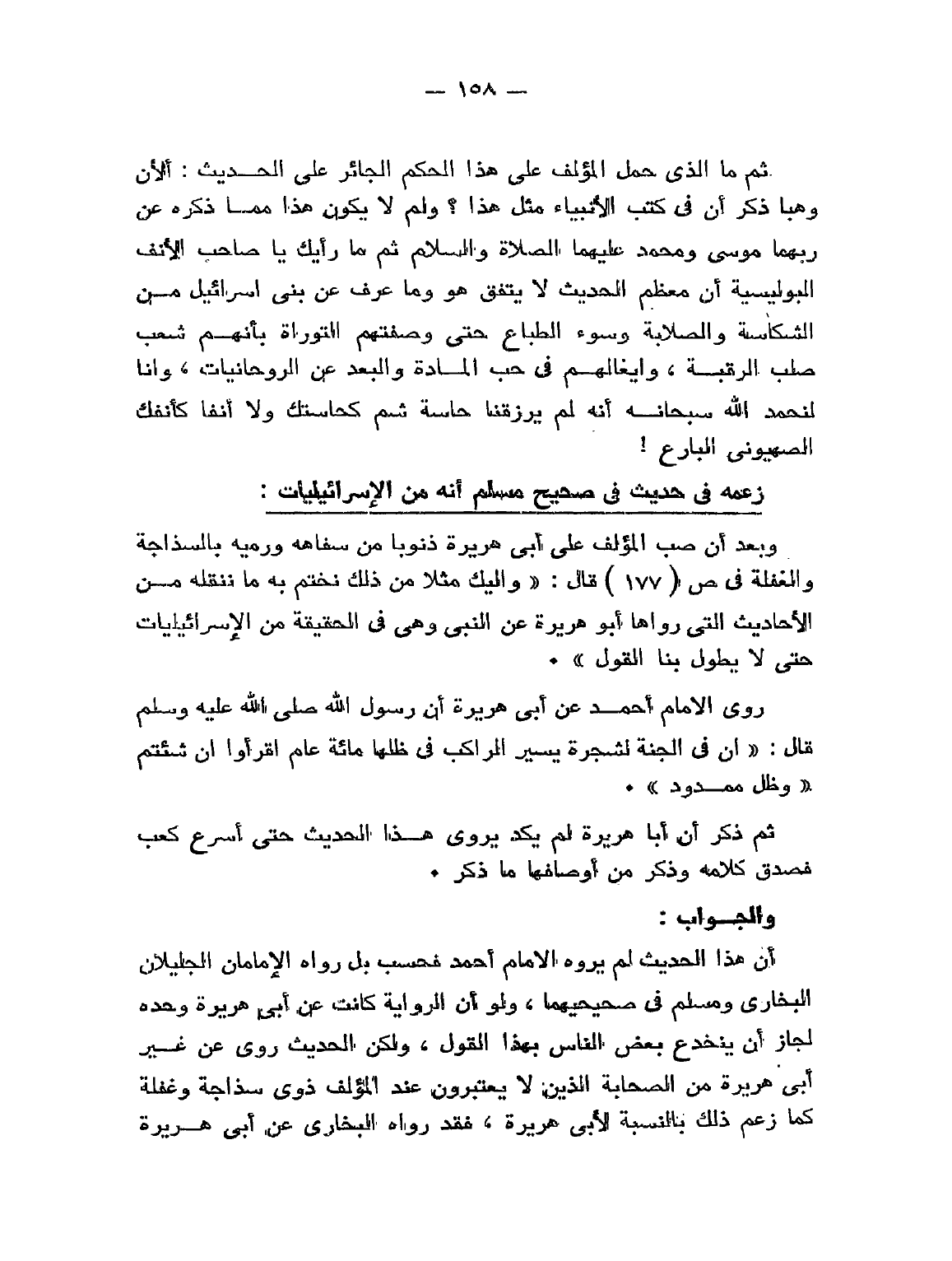 وبعد أن صب المؤلف على أبي هريرة ذَنُوبًا من سفاهه ورميه بالسذاجة والغفلة في [ص 177] قال: «وإليك مثلا من ذلك نختم به ما نقله من الأحاديث التي رواها أبو هريرة عن النَّبِيِّ وهي في الحقيقة من الإسرائيليات حتى لا يطول بنا القول».