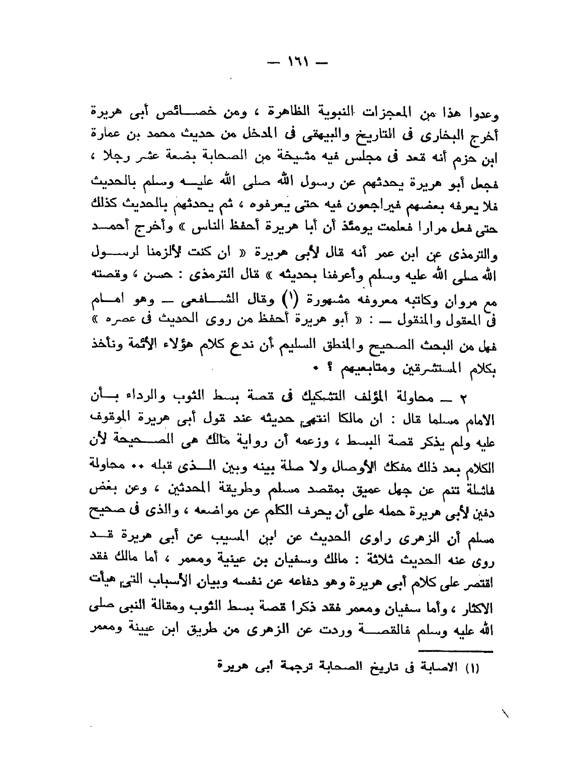 2 - محاولة المؤلف التشكيك في قصة بَسْطِ الثَّوْبِ وَالرِّدَاءِ بأن الإمام مسلمًا قال: إن مالكًا انتهى حديثه عند قول أبي هريرة الموقوف عليه ولم يذكر قصة البسط، وزعمه أن رواية مالك هي الصحيحة لأن الكلام بعد ذلك مفكك الأوصال ولا صلة بينه وبين الذي قبله ... محاولة فاشلة تنم عن جهل عميق بمقصد مسلم وطريقة المُحَدِّثِينَ، وعن بغض دفين لأبي هريرة حمله على أن يُحَرِّفَ الكلم عن مواضعه، والذي في " صحيح مسلم " أن الزُّهْرِي راوي الحديث عن ابن المسيب عن أبي هريرة قد روى عنه الحديث ثلاثة: مالك وسفيان بن عيينة ومعمر، أما مالك فقد اقتصر على كلام أبي هريرة وهو دفاعه عن نفسه وبيان الأسباب التي هيأت الإكثار، وأما سفيان ومعمر فقد ذكرا قصة الثوب ومقالة النَّبِيِّ - صَلََّى اللهُ عَلَيْهِ وَسَلَّمَ - فالقصة وردت عن الزُّهْرِي من طريق ابن عيينة ومعمر