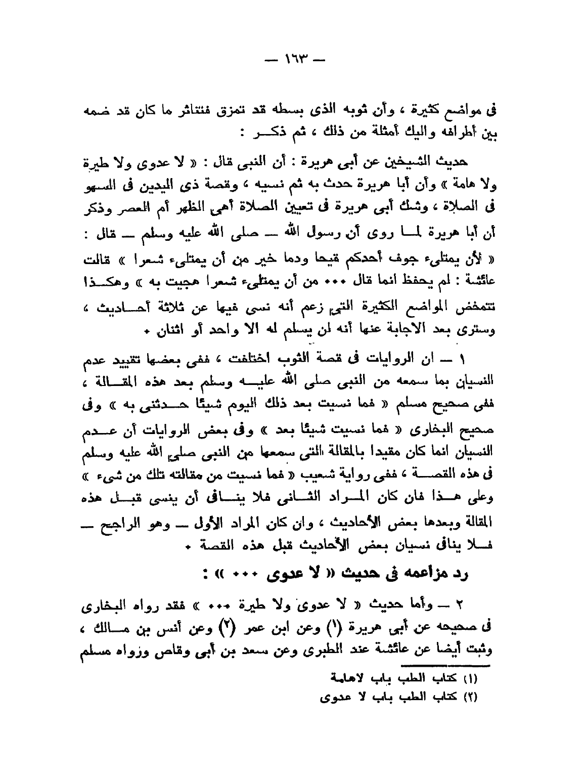 في مواضع كثيرة، وأن ثوبه الذي بسطه قد تمزق فتناثر ما كان قد ضمه بين أطرافه وإليك أمثلة من ذلك، ثم ذكر: حديث الشيخين عن أبي هريرة: أن النَّبِي - صَلََّى اللهُ عَلَيْهِ وَسَلَّمَ - قال: «لاَ عَدْوَى وَلاَ طِيَرَةَ وَلاَ هَامَةَ» وأن أبا هريرة حدث به ثم نسيه، وقصة ذي اليدين في السهو في الصلاة، وشك أبي هريرة في تعيين الصلاة أهي الظهر أم العصر وذكر أن أبا هريرة لما روى أَنَّ رَسُولَ اللهِ - صَلََّى اللهُ عَلَيْهِ وَسَلَّمَ - قال: «لأَنْ يَمْتَلِئَ جَوْفُ أَحَدِكُمْ قَيْحًا وَدَمًا خَيْرٌ مِنْ أَنْ يَمْتَلِئَ شِعْرًا» قالت عائشة: لَمْ يَحْفَظْ إِنَّمَا قَالَ: « ... مِنْ أَنْ يَمْتَلِئَ شِعْرًا هُجِيتُ بِهِ» وهكذا تتمخض المواضع الكثيرة التي زعم أنه نسي فيها عن ثلاثة أحاديث وسترى بعد الإجابة عنها أنه لن يسلم له إِلاَّ واحد أو اثنان.