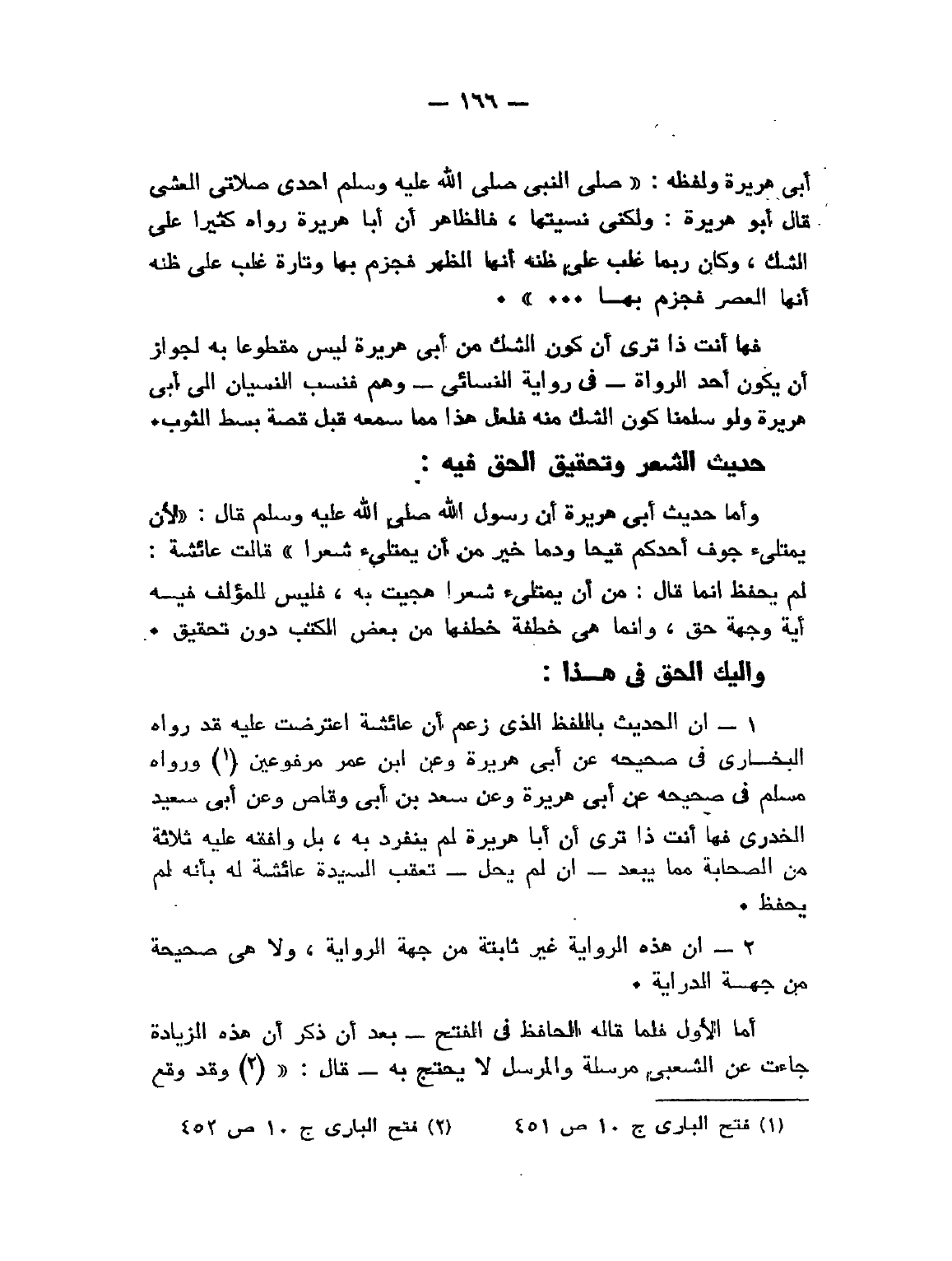وأما حديث أبي هريرة أن رسول الله - صَلََّى اللهُ عَلَيْهِ وَسَلَّمَ - قال: لأَنْ يَمْتَلِئَ جَوْفُ أَحَدِكُمْ قَيْحًا وَدَمًا، خَيْرٌ لَهُ مِنْ أَنْ يَمْتَلِئَ شِعْرًا»، قالت عائشة: لَمْ يَحْفَظْ إِنَّمَا قَالَ: «مِنْ أَنْ يَمْتَلِئَ شِعْرًا هُجِيتُ بِهِ»، فليس للمؤلف فيه أية وجهة حق، وإنما هي خطفة خطفها من بعض الكتب دون تحقيق.