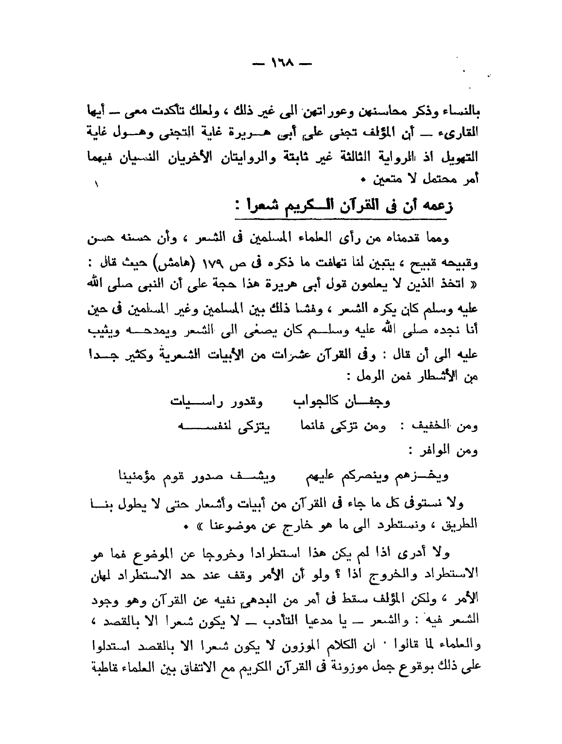 وَمِمَّا قَدَّمْنَاهُ من رأي العلماء المسلمين في الشعر، وأن حسنه حسن وقبيحه قبيح، يَتَبَيَّن لنا تهافت ما ذكره في [ص 179، هامش] حيث قال: «اتخذ الذين لا يعلمون قول أبي هريرة هذا حُجَّةً على أن النَّبِيَّ - صَلََّى اللهُ عَلَيْهِ وَسَلَّمَ - كان يكره الشعر، وفشا ذلك بين المسلمين وغير المسلمين في حين أنا نجده - صَلََّى اللهُ عَلَيْهِ وَسَلَّمَ - كان يُصْغِي إلى الشعر ويمدحه ويثيب عليه إلى أن قال: وفي القرآن عشرات من الأبيات الشعرِيَّةَ وكثير جدا من الأشطار فمن الرمل: