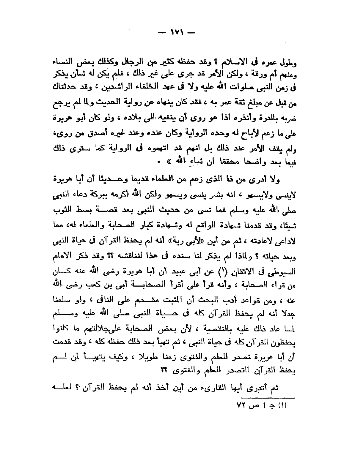 ولا أدري من ذا الذي زعم من العلماء قديمًا وحديثًا أن أبا هريرة لا ينسى ولا يسهو، إنه بشر ينسى ويسهو ولكن الله أكرمه ببركة دعاء النَّبِيِّ - صَلََّى اللهُ عَلَيْهِ وَسَلَّمَ - فما نسي من حديث النَّبِيِّ بعد قصة بسط الثوب شيئًا، وقد قدمنا شهادة الواقع له وشهادة كبار الصحابة والعلماء له، مِمَّا لا داعي لإعادته، ثم من أين «لأَبِي رَيَّةَ» أنه لم يحفظ القرآن في حياة النَّبِيِّ وبعد حياته؟ ولماذا لم يذكر لنا سنده في هذا لنناقشه؟؟ وقد ذكر الإمام السيوطي في " الإتقان " (¬1) عن أبي عبيد أن أبا هريرة - رَضِيَ اللهُ عَنْهُ - كان من قُرَّاء الصحابة وأنه قرأ على أقرأ الصحابة أُبَيٍّ بْنِ كَعْبٍ - رَضِيَ اللهُ عَنْهُ - ومن قواعد أدب البحث أن المثبت مقدم على النافي، ولو سلمنا جدلاً أنه لم يحفظ القرآن كله في حياة النَّبِيِّ - صَلََّى اللهُ عَلَيْهِ وَسَلَّمَ - لما عاد ذلك عليه بالنقيصة، لأن بعض الصحابة على جلالتهم ما كانوا يحفظون القرآن كله في حياة النَّبِيِّ، ثم تهيأ بعد ذلك حفظه كله، وقد قدمت أن أبا هريرة تصدر للعلم والفتوى زمنًا طويلاً، وكيف يتهيأ لمن لم يحفظ القرآن التصدر للعلم والفتوى؟؟.