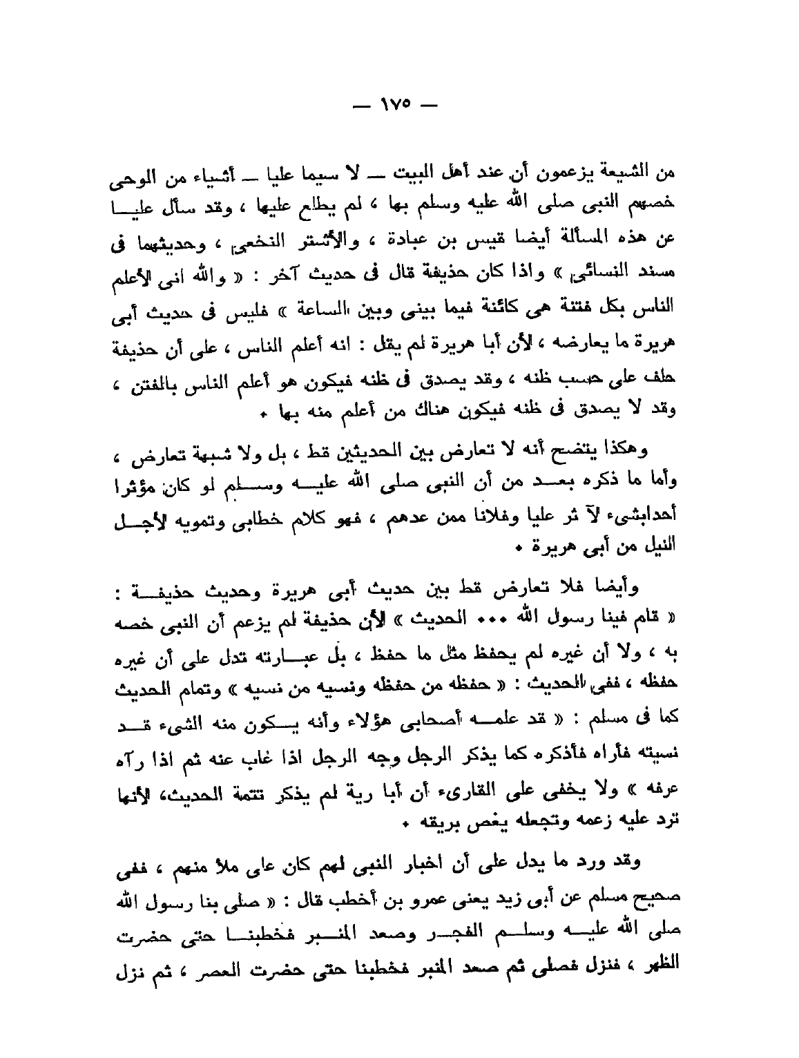 مِنَ الشِّيعَةِ كَانُوا يَزْعُمُونَ أَنَّ عِنْد أَهْلِ البَيْتِ - لاَ سِيَّمَا عَلِيًّا - أَشْيَاءَ مِنَ الوَحْيِ خَصَّهُمْ النَّبِيُّ صَلَّى اللَّه عَلَيْهِ وَسَلَّمَ بِهَا لَمْ يُطْلِع [غَيْرَهُمْ] عَلَيْهَا. وَقَدْ سَأَلَ عَلِيًّا عَنْ هَذِهِ المَسْأَلَة أَيْضًا قَيْسُ [بْنُ عُبَادٍ] (*) وَالأَشْتَر النَّخَعِيُّ وَحَدِيثُهُمَا فِي " مُسْنَد النَّسَائِيِّ "». وإذا كان حذيفة قال في حديث آخر: «وَاَللَّه إِنِّي لأَعْلَمُ النَّاسِ بِكُلِّ فِتْنَة هِيَ كَائِنَةٌ فِيمَا بَيْنِي وَبَيْنَ السَّاعَةِ» فليس في حديث أبي هريرة ما يعارضه، لأن أبا هريرة لم يقل: إنه أعلم الناس، على أن حذيفة حلف على حسب ظنه، وقد يصدق في ظنه فيكون هو أعلم الناس بالفتن، وقد لا يصدق في ظنه فيكون هناك من أعلم منه بها.