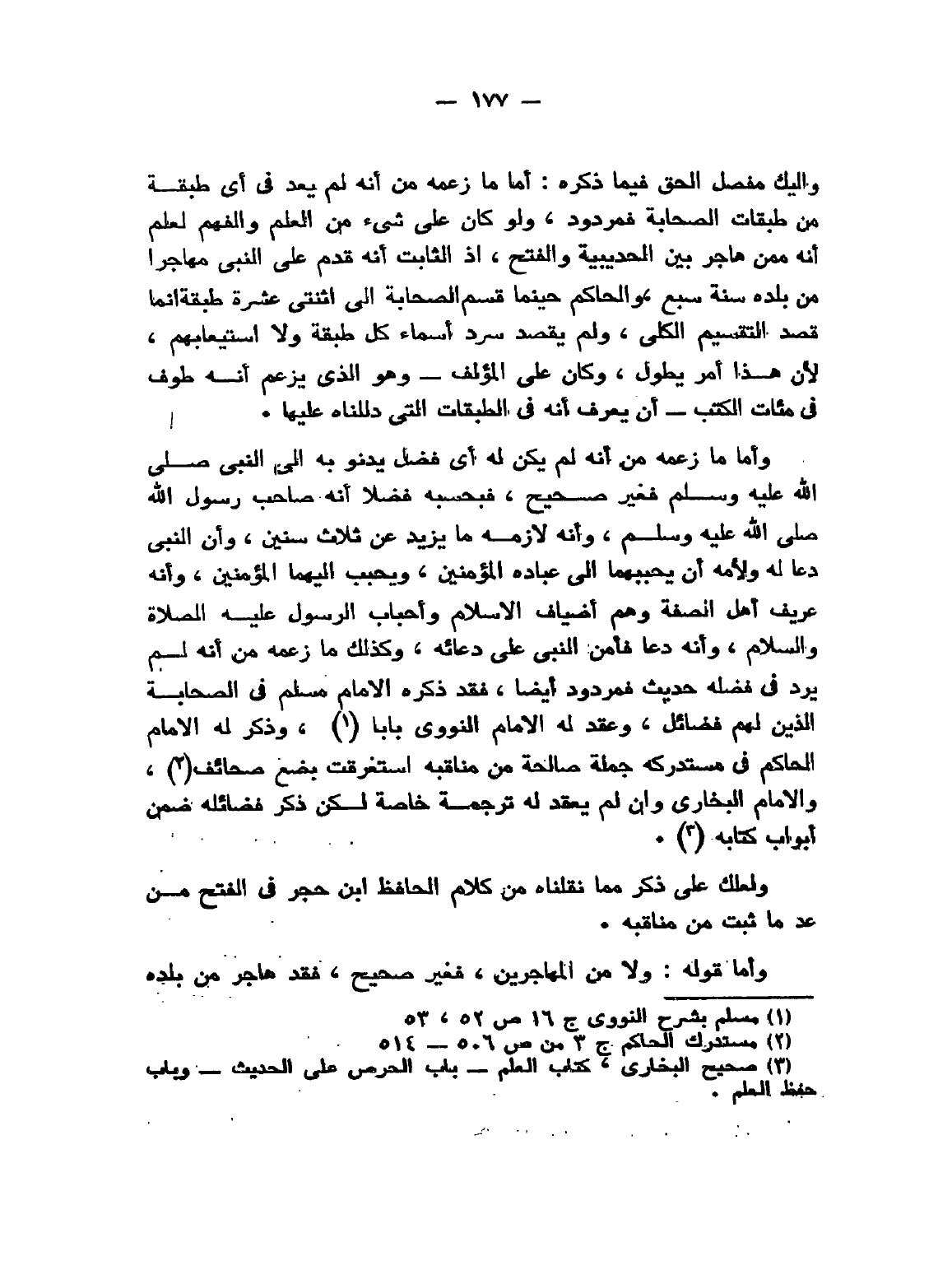 وإليك مفصل الحق فيما ذكره: أما ما زعمه من أنه لم يعد في أي طبقة من طبقات الصحابة فمردود، ولو كان على شيء من العلم والفهم لعلم أنه مِمَّنْ هاجر بين الحديبية والفتح، إذ الثابت أنه قدم على النَّبِيِّ مهاجرًا من بلده سَنَةَ سَبْعٍ، والحاكم حينما قسم الصحابة إلى اثتني عشرة طبقة إنما قصد التقسيم الكلي، ولم يقصد سرد أسماء كل طبقة ولا استيعابهم، لأن هذا أمر يطول، وكان على المؤلف - وهو الذي يزعم أنه طوف في مئات الكتب - أن يعرف أنه في الطبقات التي دللناه عليها.